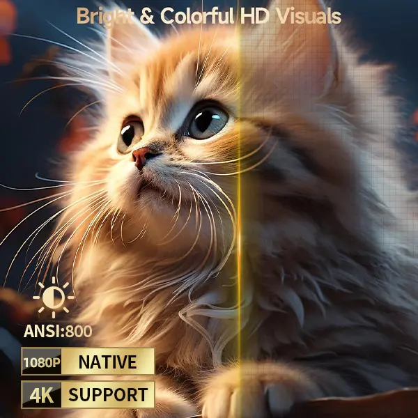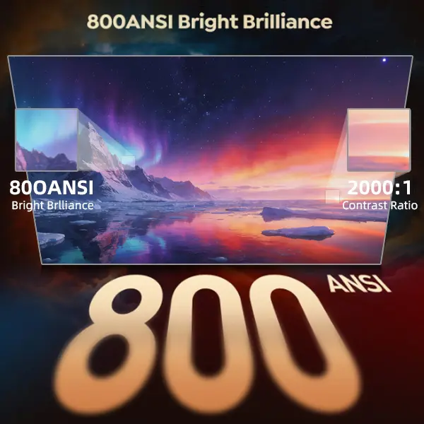 This projector delivers 800 ANSI lumens, ensuring vivid and clear visuals. Perfect for immersive entertainment. It supports 4K decoding and 1080P resolution for optimal viewing. The built-in speaker provides immersive audio. 🎥