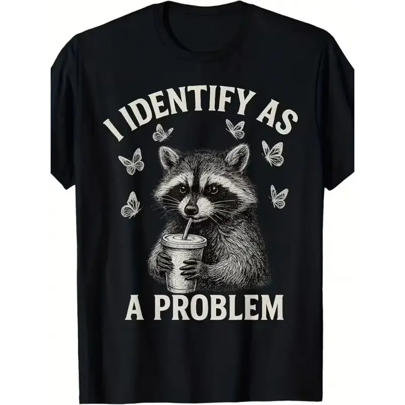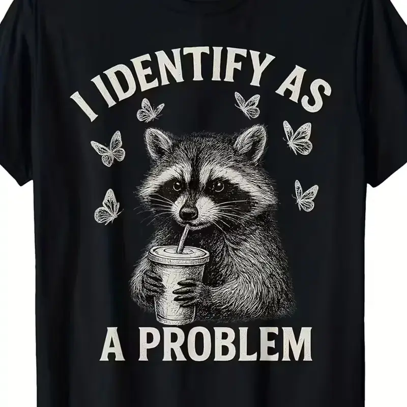 2026 "I Identify As A Problem" Raccoon Funny T-Shirt Classic Crewneck Short Sleeve Tee for Men Casual Cotton Whimsical Design