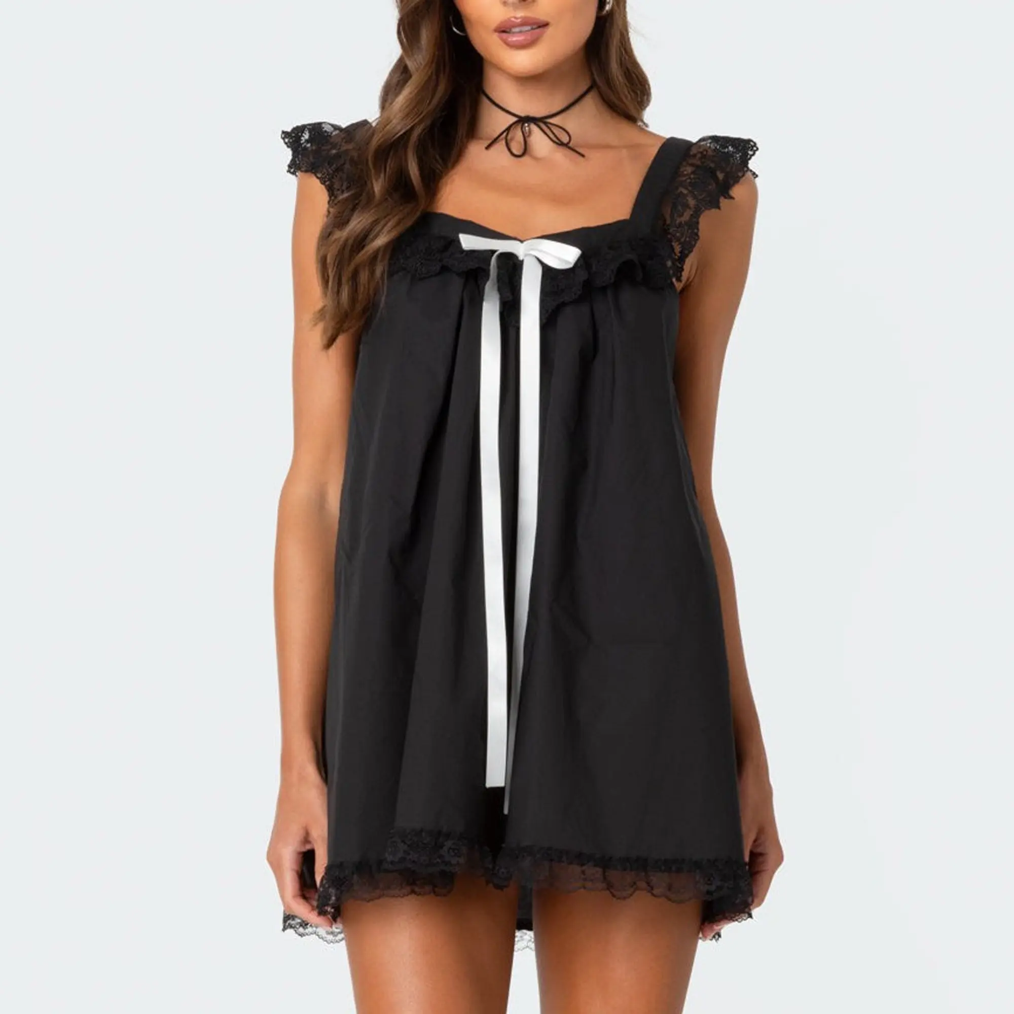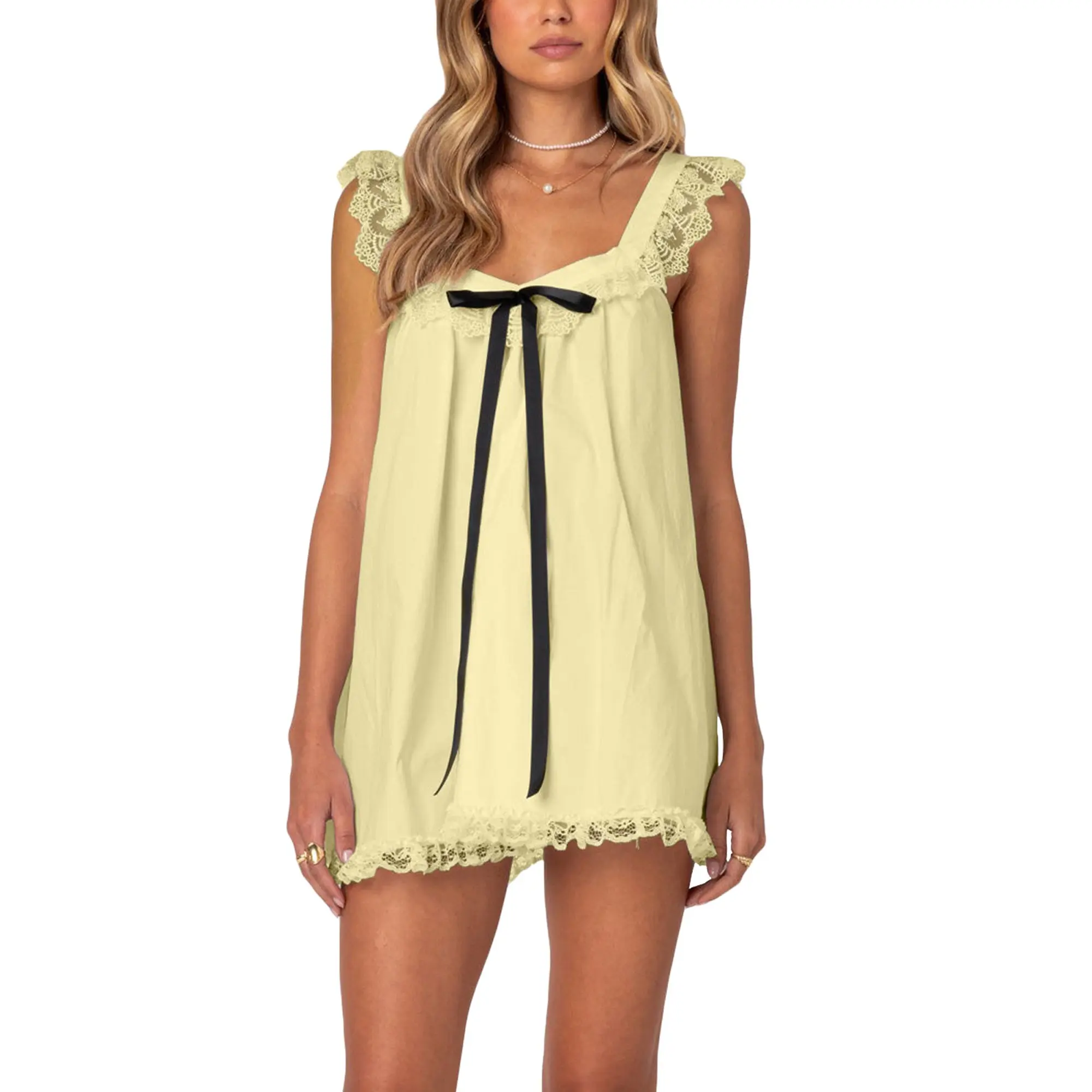 Woman's Coquette Square Neck Lace Trim Bow Mini Dress, Breathable Lightweight Cotton, Loose A Line Slimming Slip Dress, Multicolor Spring Summer Casual Dress, For Daily Date Picnic Party Outing, Trendy TikTok Aesthetic Sweet Cool Short Dress