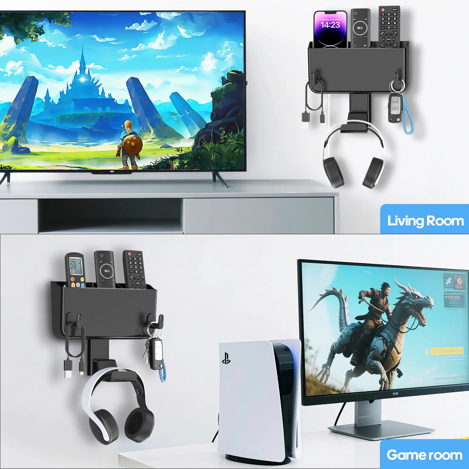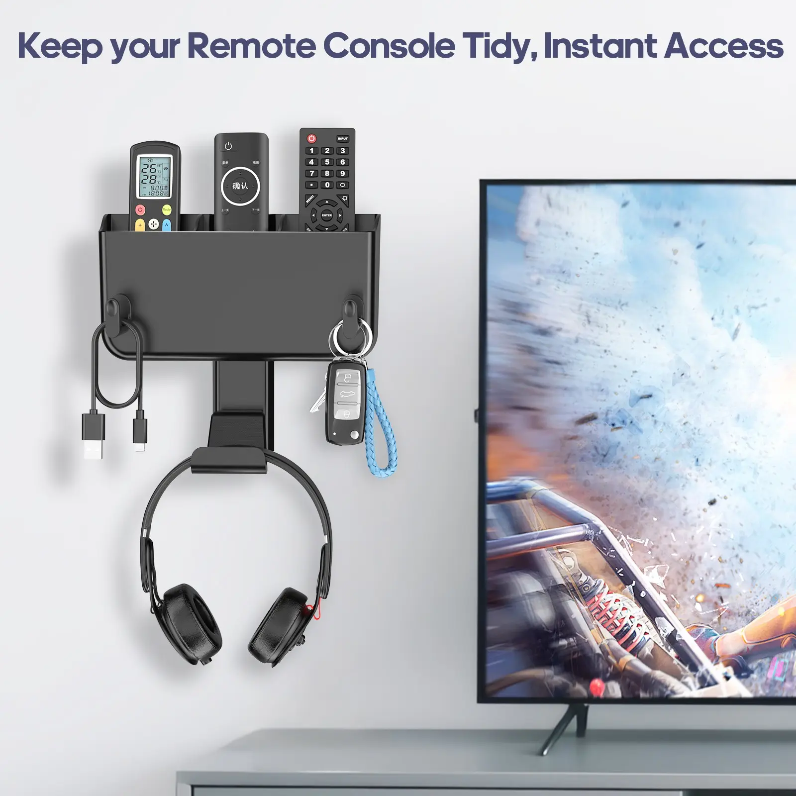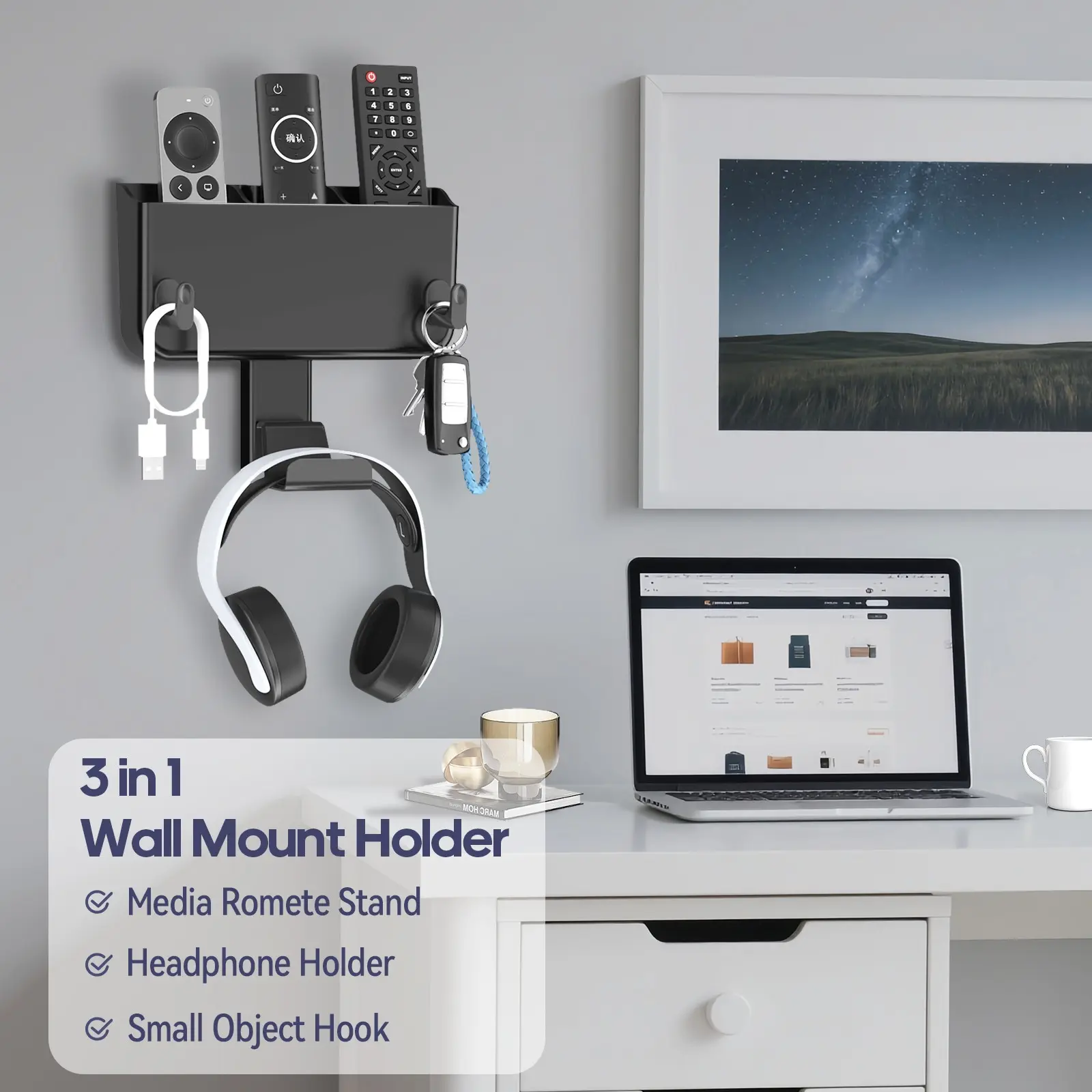 Adhesive Remote Control Holder Wall Mount with Headset Hanger, 3 in 1 Organizer TV/Fan Remote Caddy with Hook for Headphone, No Drill Controller Storage Bracket, Bed Wall Rack