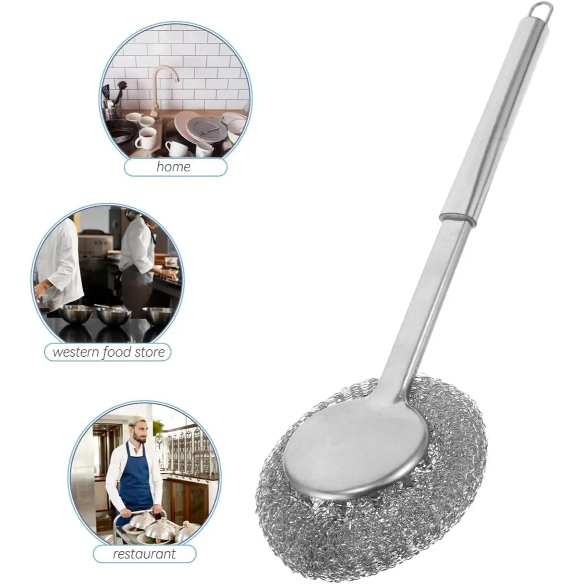 Stainless Steel Pot Brush, Kitchen Specialized Cleaning Tool, Long Handle Dishwasher Safe, Durable Wire Ball Brush, No Threads Shedding