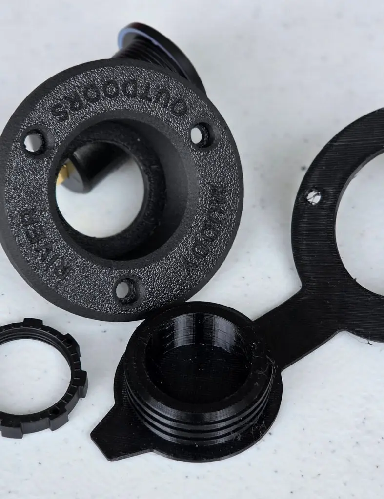 The Power Plug Mount and Cover is a through-the-wall, water-resistant outlet designed to add exterior power access to your vehicle, trailer, or camper build. It accepts any standard 12V accessory designed for a 1" mount (USB outlet, cigarette lighter socket, voltmeter, etc.). For installation, simply cut a 1 7/8" hole in your panel or wall.
