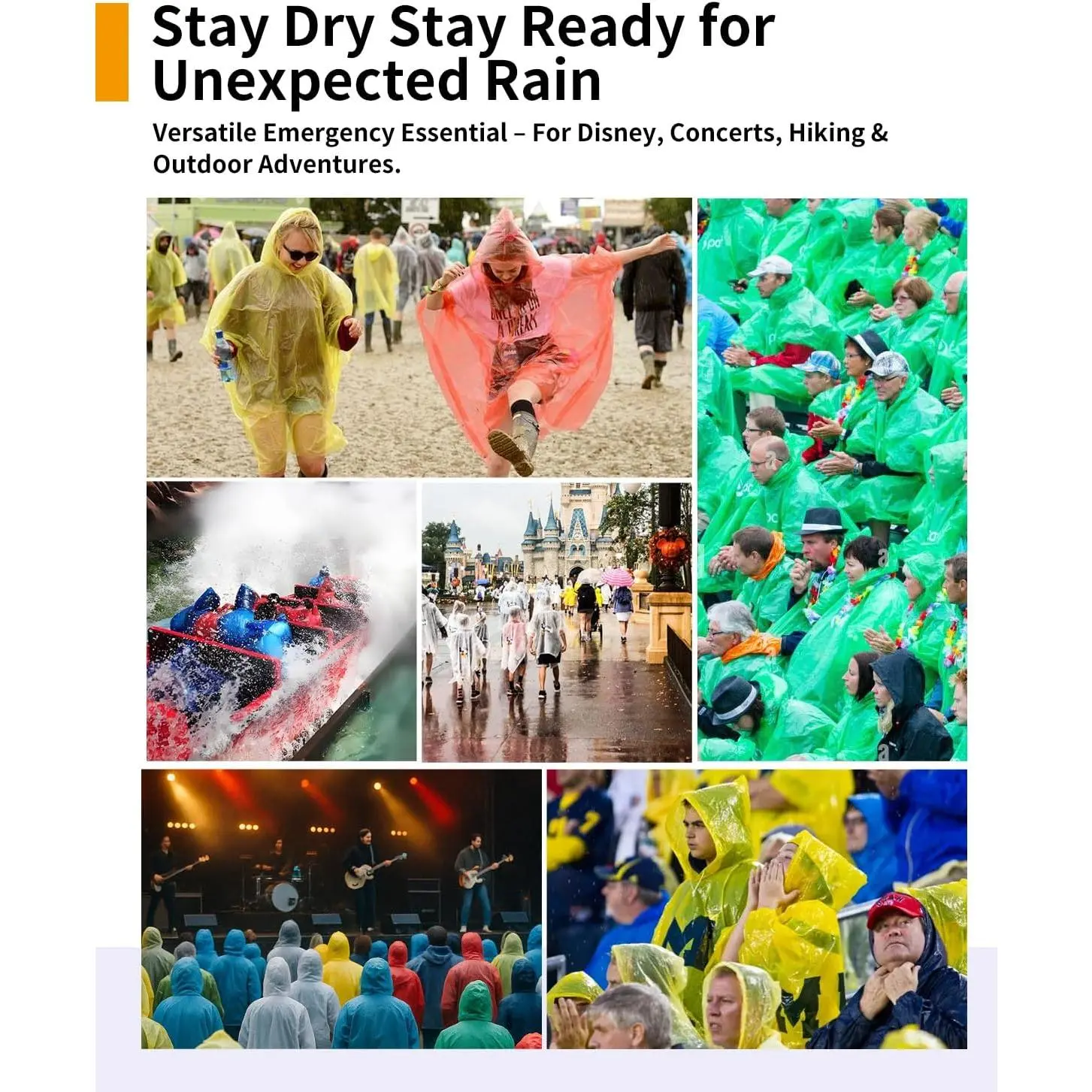Be Ready for the Unexpected – Whether you're heading to concerts, theme parks, camping trips, or sports games, or stocking your Home Emergency Survival Kits, our disposable rain ponchos for adults keep you dry when the weather changes fast.Each pack includes individually wrapped ponchos for easy grab-and-go convenienceThicker & Stronger for True Protection – Unlike flimsy alternatives, our PE rain ponchos are built to last through sudden storms and wet conditions.The adult version features a drawstring hood for added wind resistanceMultiple Sizes & Vibrant Colors for the Whole Family – Available in 6, 12, or 24 packs, choose from 10 bright colors including clear, red, yellow, blue, pink, green, and more.Our family pack ponchos are generously sized (Adult: 50"x45", Kid: 40"x30") and designed to fit over backpacks or coatsPackable, Lightweight, and Travel-Friendly – Planning a festival, camping weekend, or hiking adventure?Each poncho folds into a compact pouch that fits in your pocket, car glove box, purse, or survival kit.Ideal for emergencies and all-season travel rainwear needsBreathe Easy with Cape-Style Comfort – Our ponchos feature an extended length and roomy cape design that improves airflow, prevents clinging, and keeps you dry without feeling hot or trapped.Great for summer rainstorms and active outdoor use#625 in Tools & Home Improvement (See Top 100 in Tools & Home Improvement)# 1 in Home Emergency Survival Kits#625 in Tools & Home Improvement (See Top 100 in Tools & Home Improvement)# 1 in Home Emergency Survival Kits