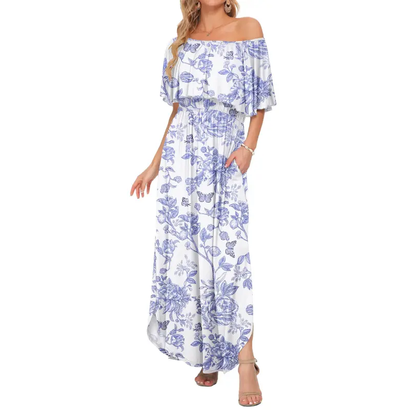 [Restocked] AUSELILY Women's Off The Shoulder Dress Wedding Guest Dress Summer Casual Long Ruffle Party Side Split Beach Maxi Dresses with Pockets