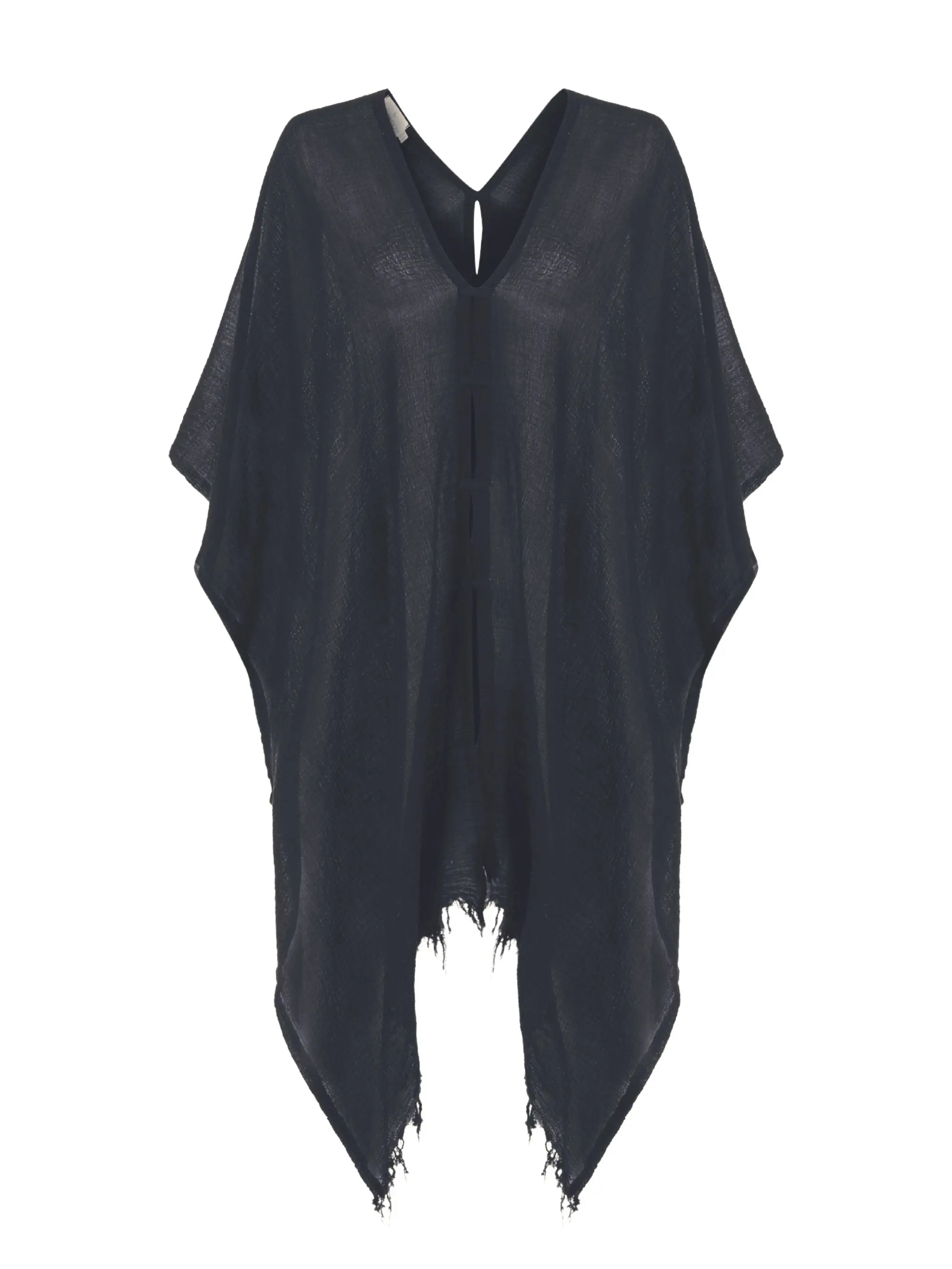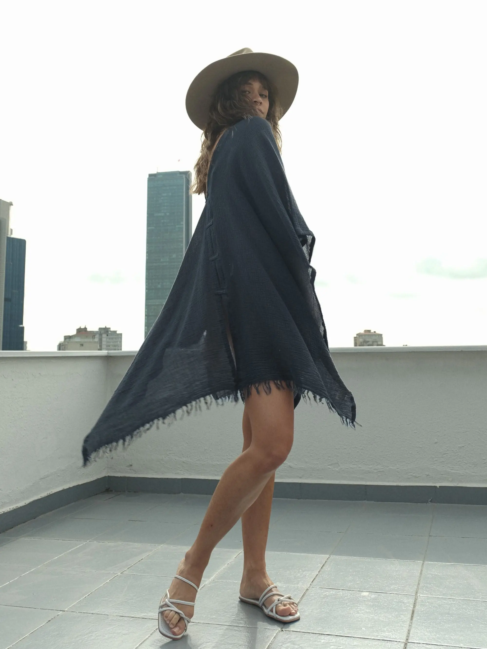 Make a memorable statement by the sea or in the lounge with the hand loomed Ava Kimono Navy. An asymmetric frayed hem along with side slits, add movement and flow to a roomy drape. Featured artisanal striped motifs woven into its flowy fabric which boasts a linen-like feel. Breathable fibers and naturally built-in cooling properties make this the perfect beach kaftan.