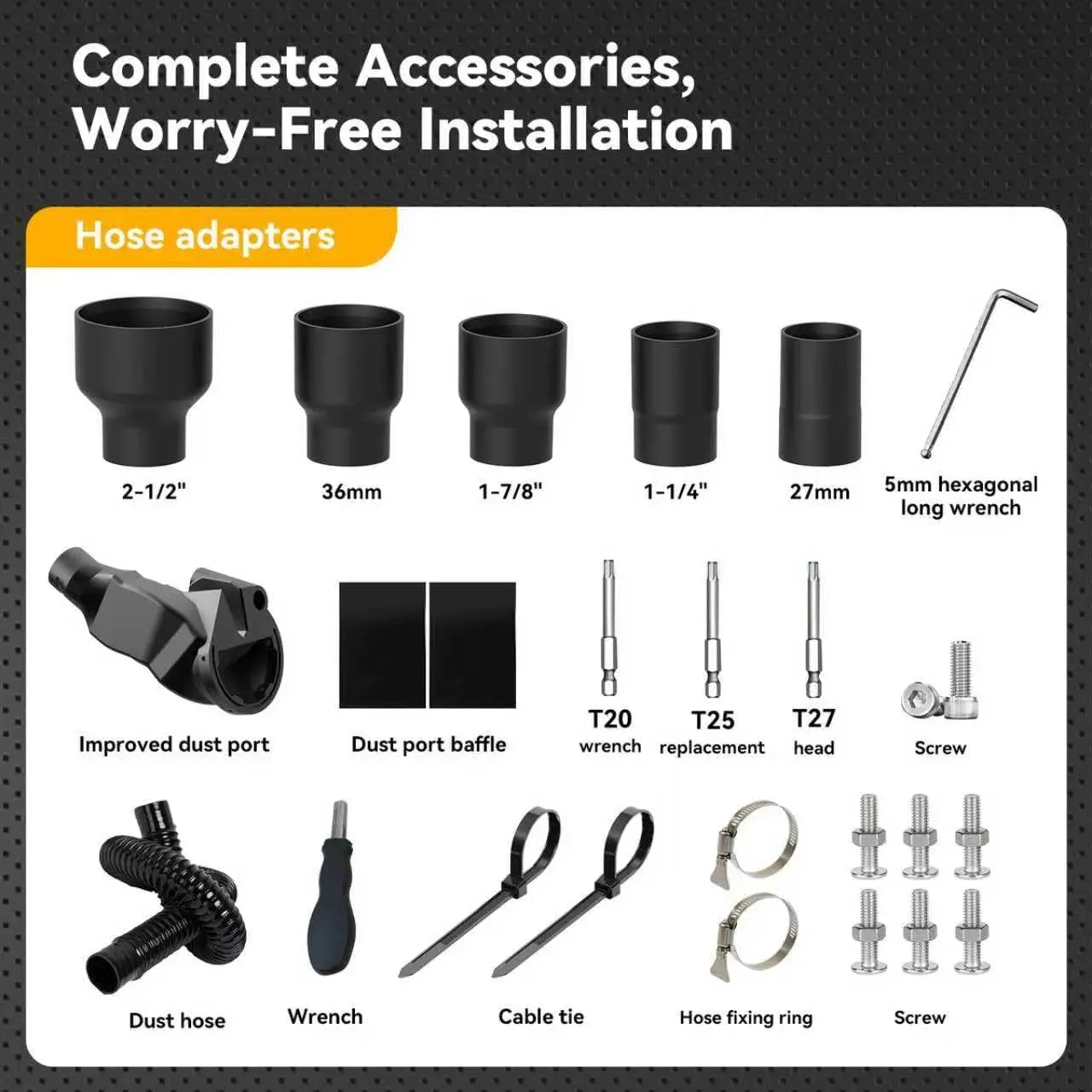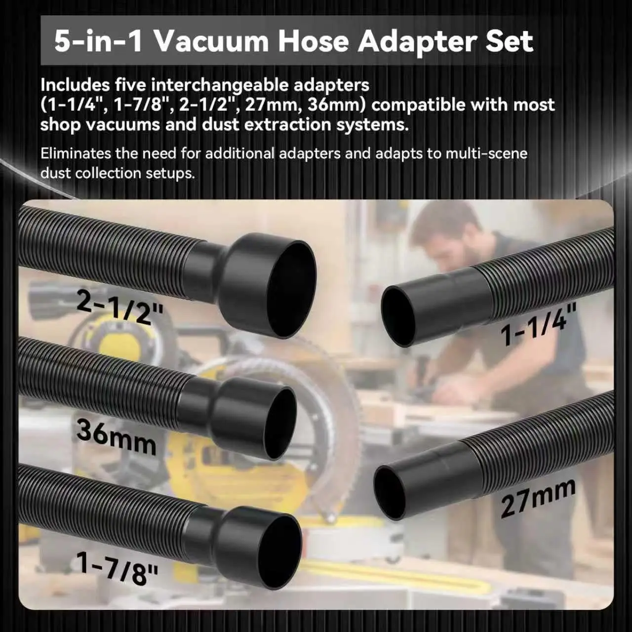 [5-in-1 Vacuum Hose Adapter Set] Includes five interchangeable adapters (1-1/4", 1-7/8", 2-1/2", 27mm, 36mm) compatible with most shop vacuums and dust extraction systems.Eliminates the need for additional adapters and adapts to multi-scene dust collection setups.