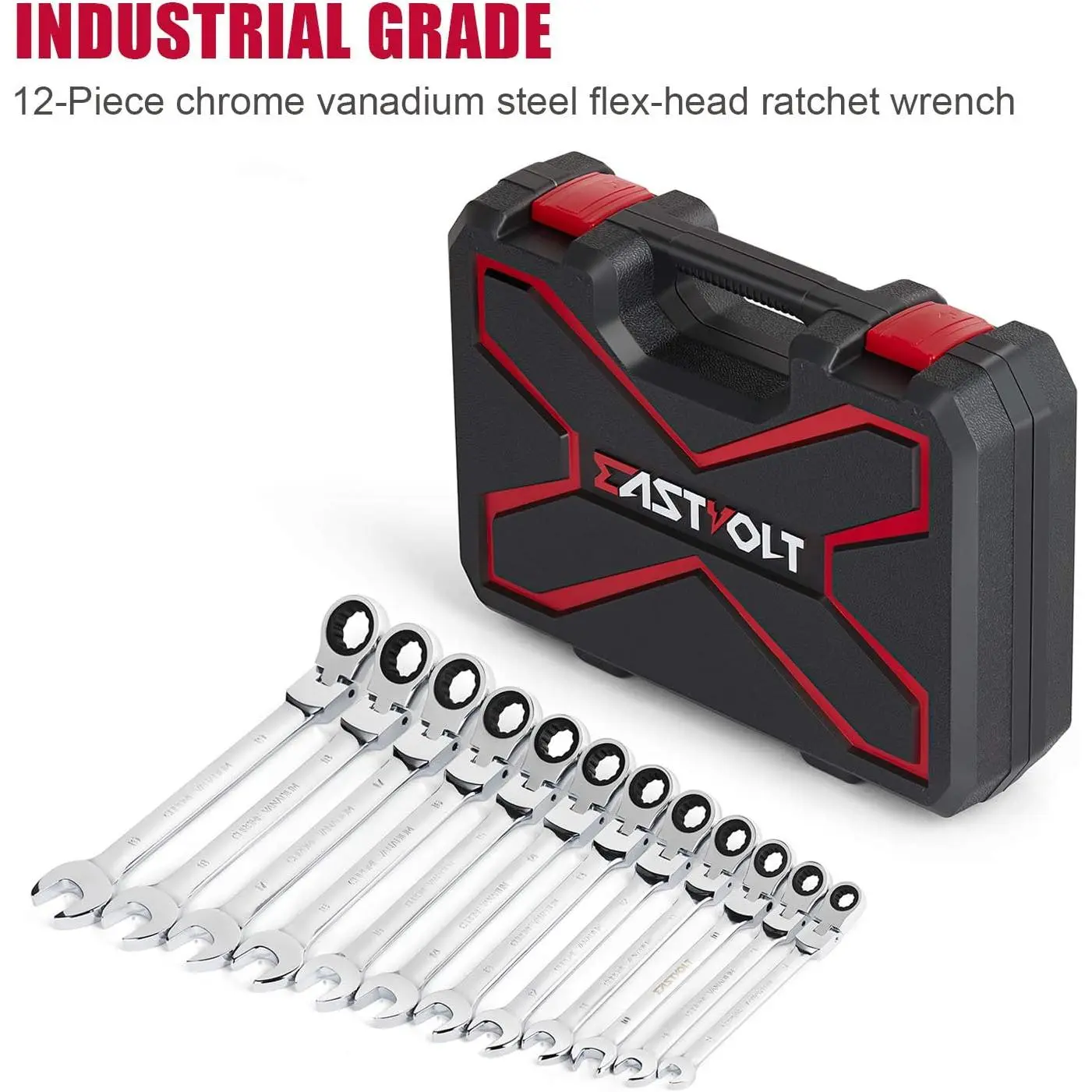 12-Piece Flex-Head Ratcheting Combination Wrench Set, Metric Sizes 8mm, 9mm, 10mm, 11mm, 12mm, 13mm, 14mm, 15mm, 16mm, 17mm, 18mm, 19mm, Reversible Ratcheting Box End with 15-Degree Flex Head, Open End for Increased Access, Forged from Chrome Vanadium Steel for Strength and Corrosion Resistance, Includes Durable Plastic Toolbox for Storage and Portability