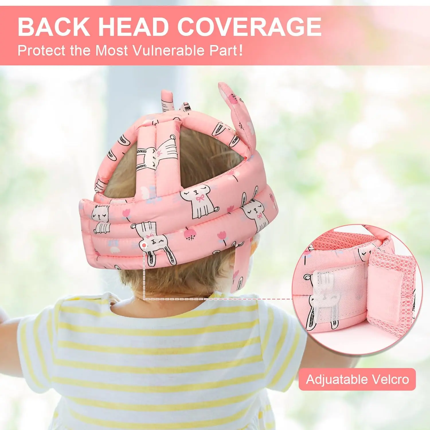 ·【Adjustable Size for Growing Toddlers】Safety toddler helmet adjustable 15-21 inch circumference is specially designed to suit any size of infant head, which guarantees maximum head protection for babies 6-24 months. The infant head protection helmet features an adjustable Velcro nylon strap, allowing for flexible customization to fit your baby's needs perfectly. No more worries about it being too loose or too tight—it's ideal for every infant.