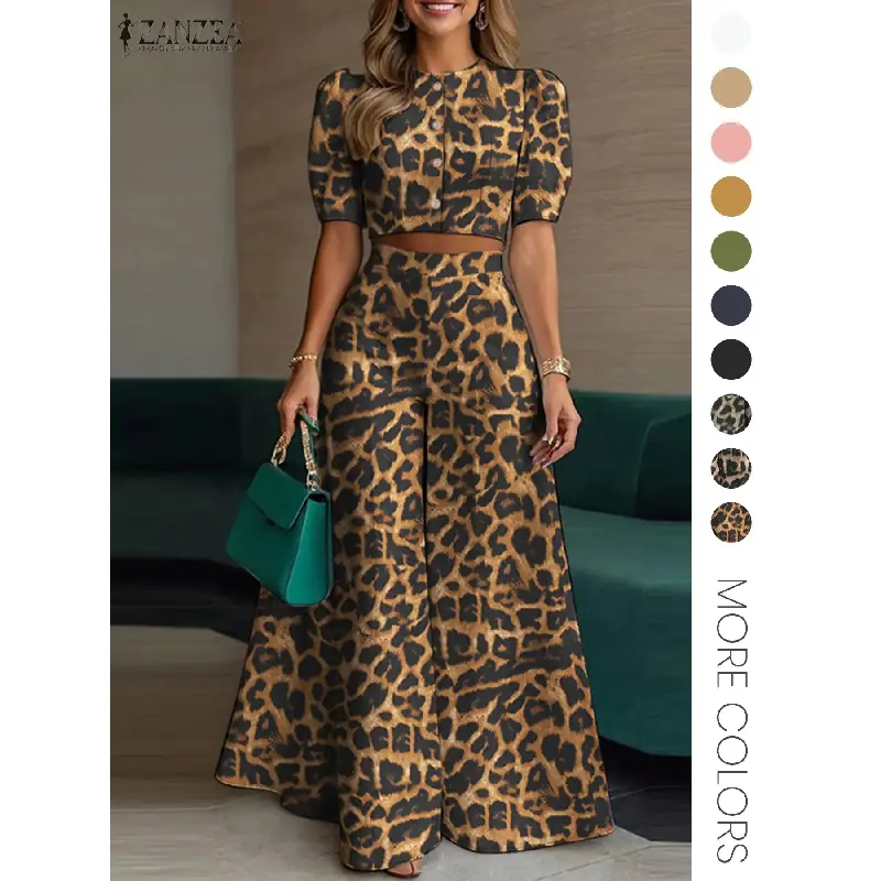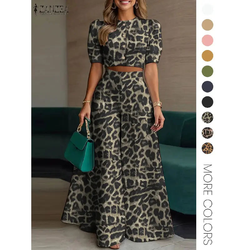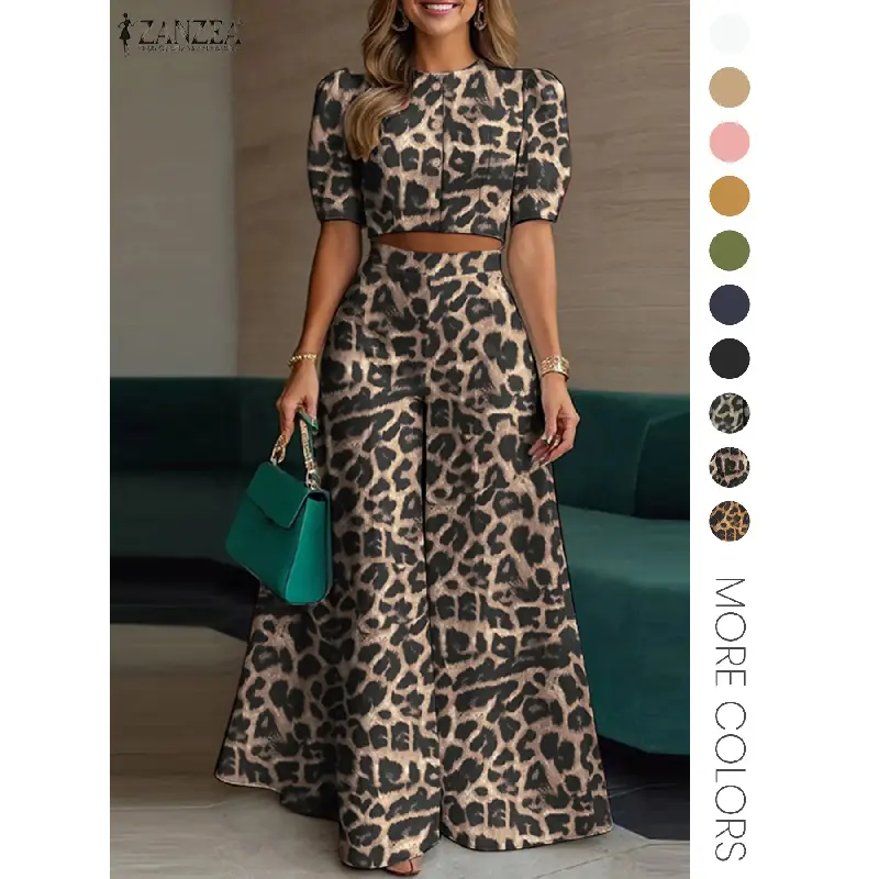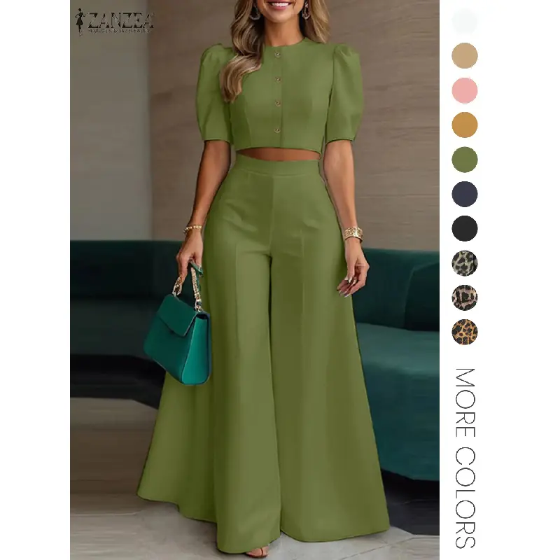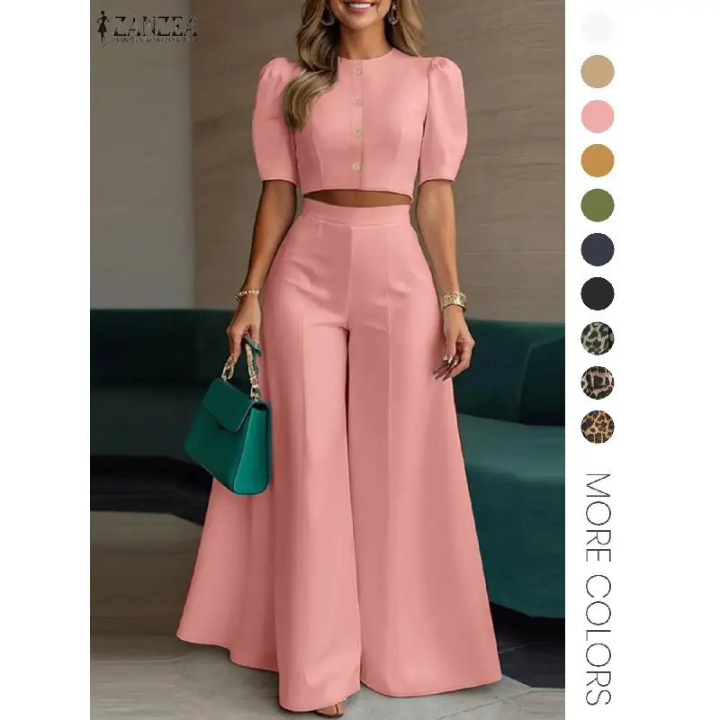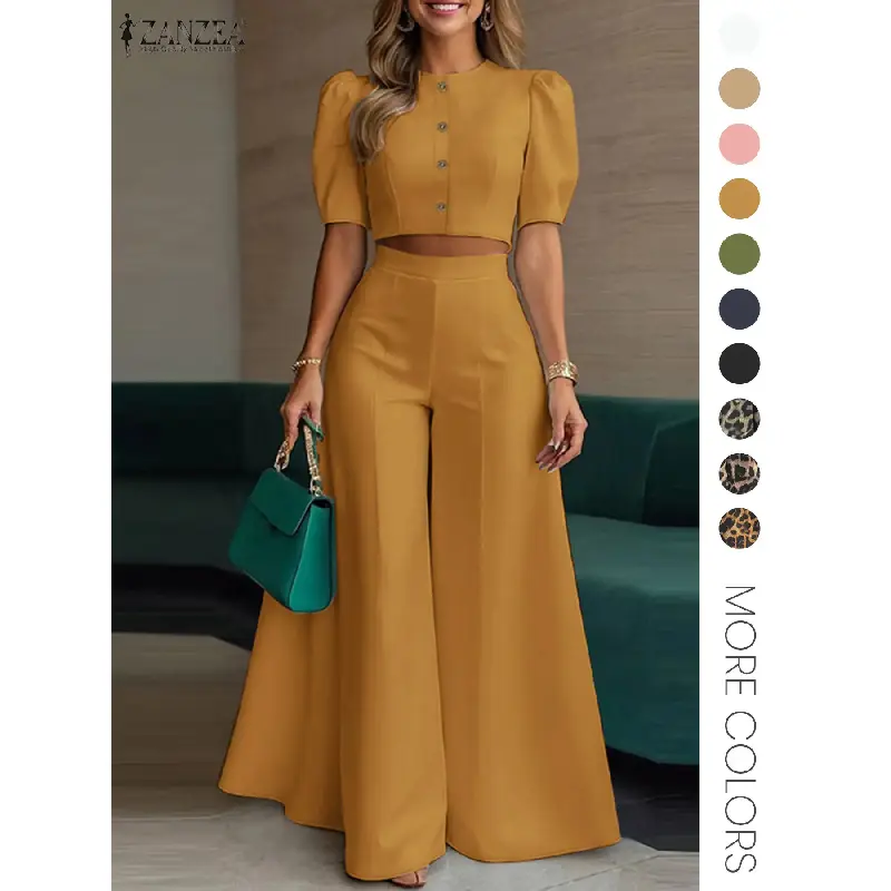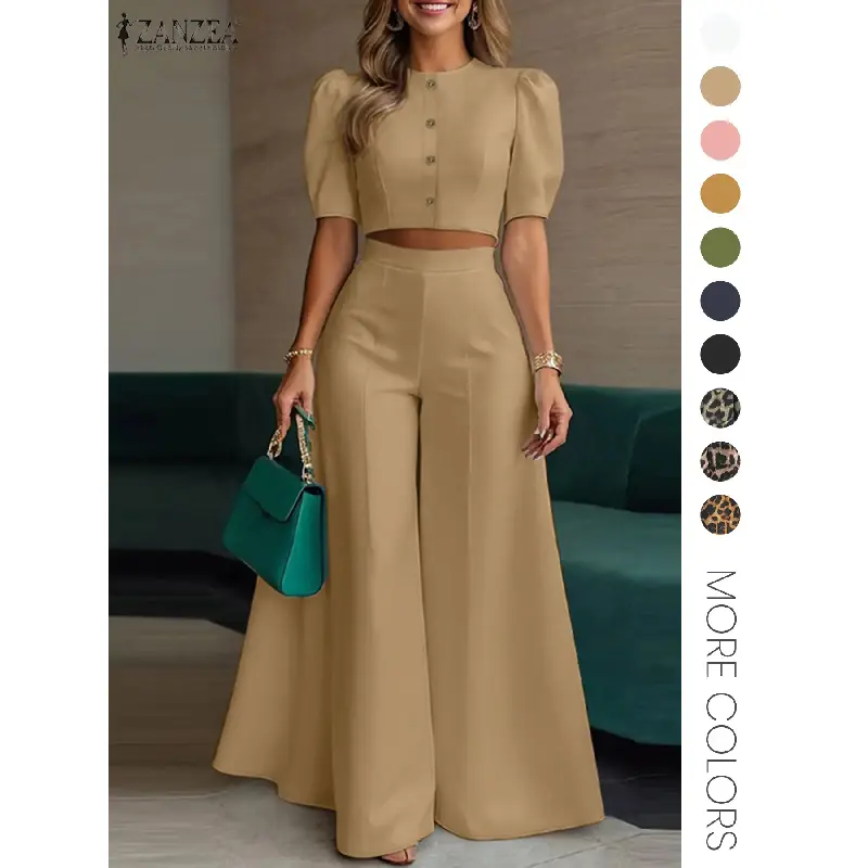 Women's Two Piece Plain Woven Crop Top High Waist Elastic Wide Leg Pants Summer Daily Wear Elegant Fashion Outfit Set
