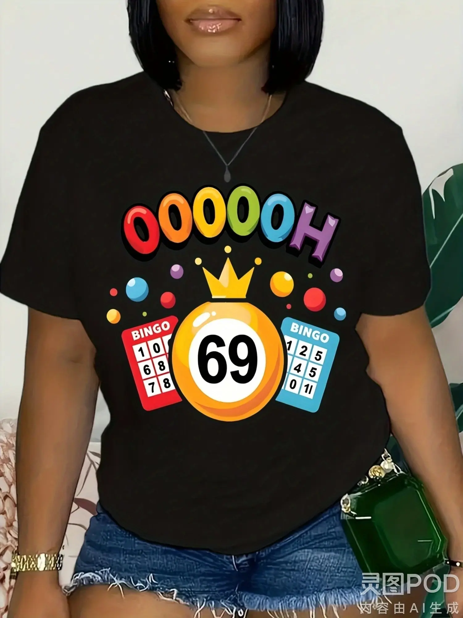 OOOOOH 69 Bingo Ball Crown Pattern T-shirt - Bingo Night Party Shirt, featuring numbers 1-75, soft 220gsm heavyweight T-shirt, suitable for game nights, bingo competitions, and themed parties - Unisex casual top, suitable for men and women - Vintage Bingo