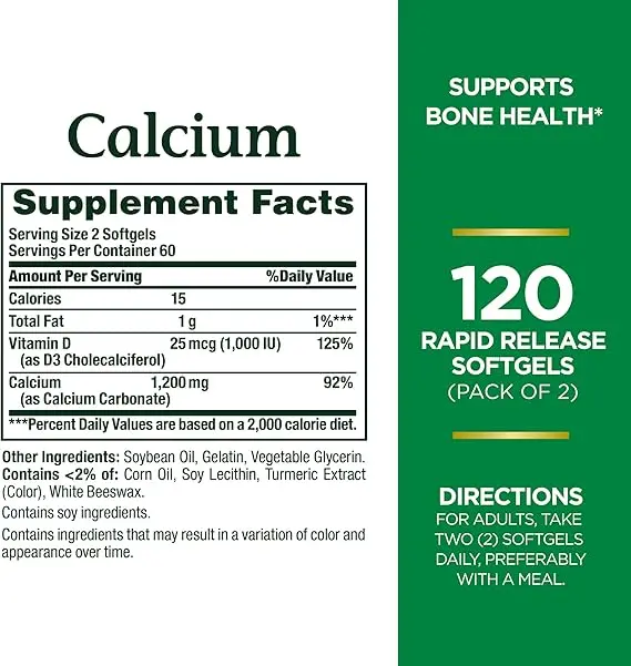 Nature's Bounty Calcium 1200 mg with Vitamin D3 - Bone Health Softgels, Calcium and Vitamin D Supplement, 120 Ct (2-Pack)