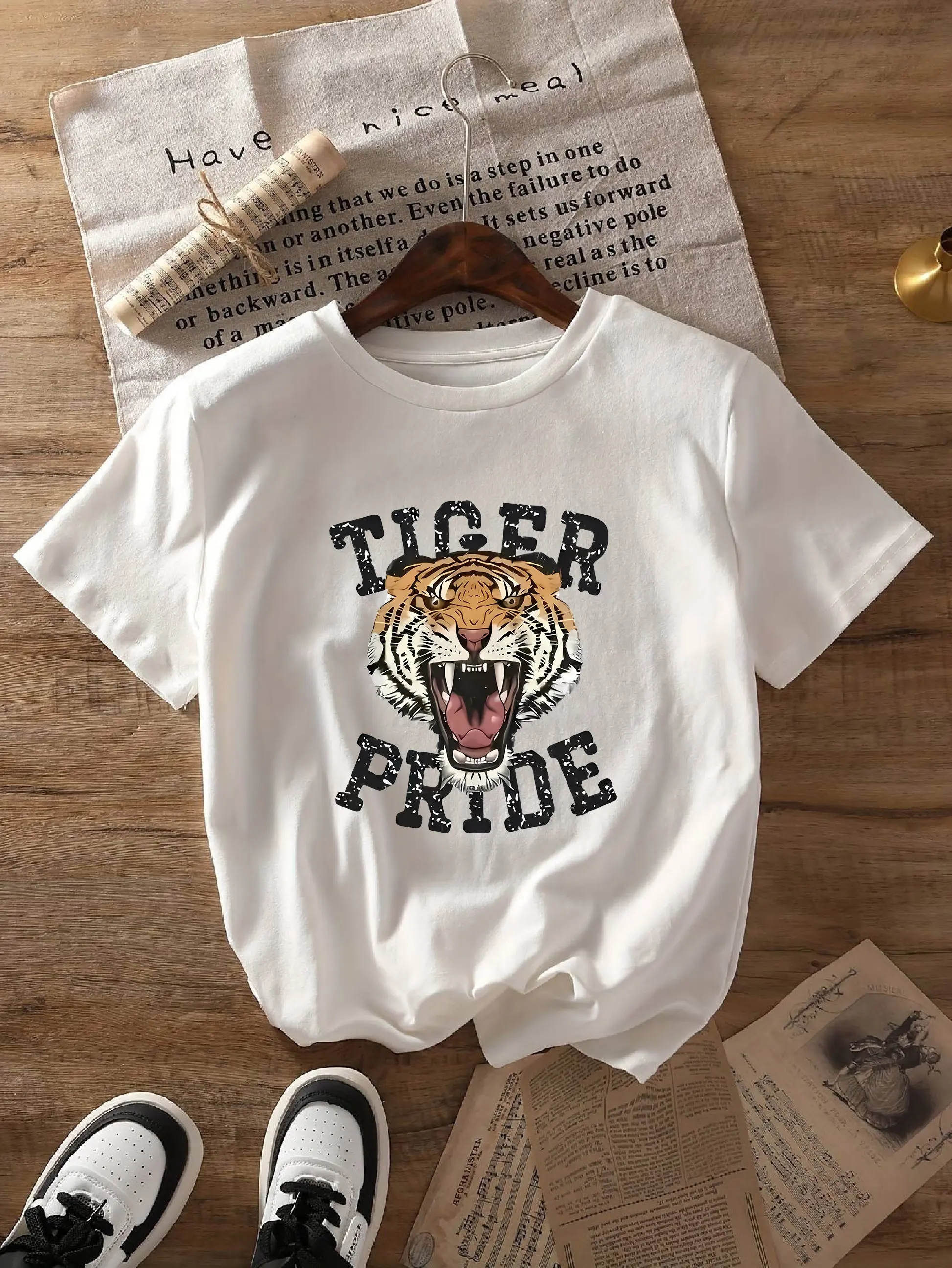 Tiger Head Print T-shirt, Short Sleeve Crew Neck Casual Top For Summer & Spring, Women's Clothing