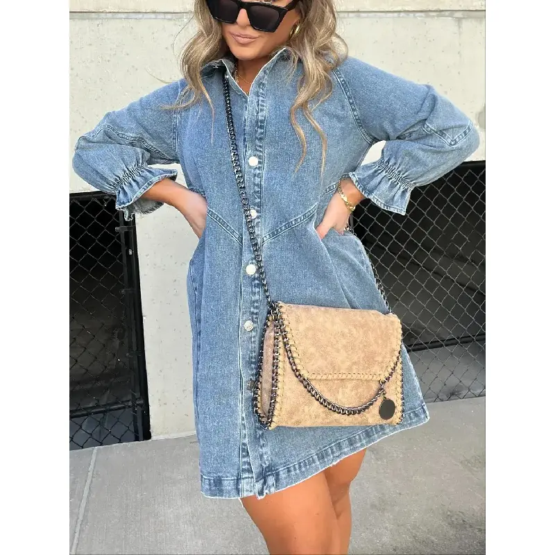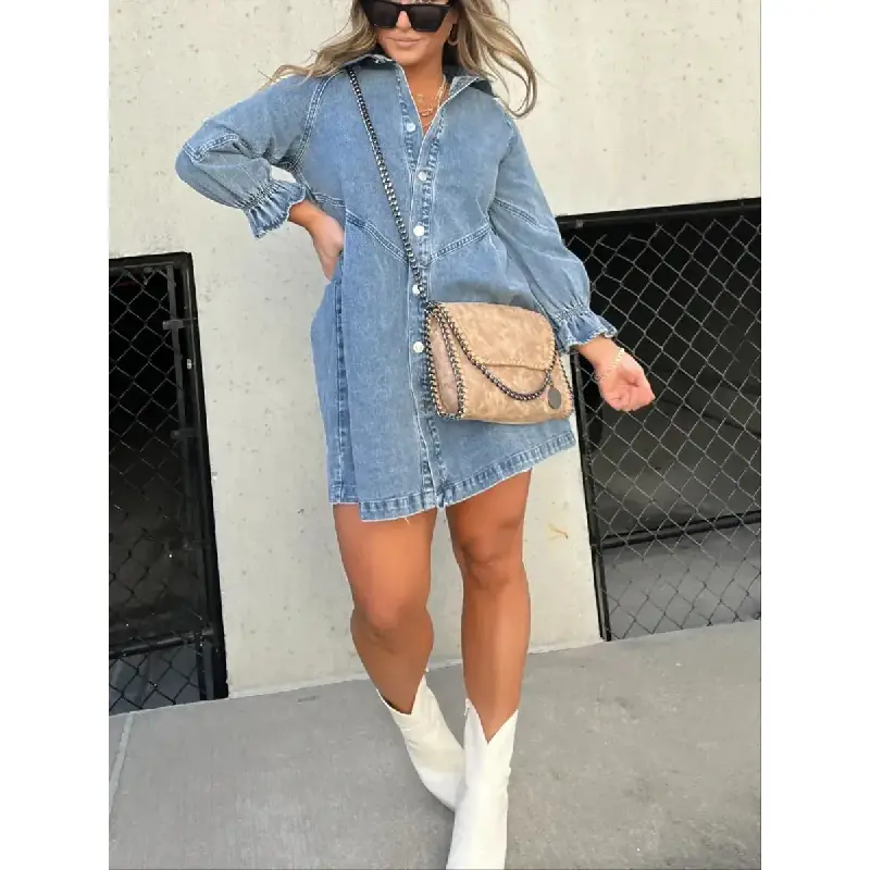This denim dress has a shorter skirt length and Semi-balloon 3/4 sleeves.