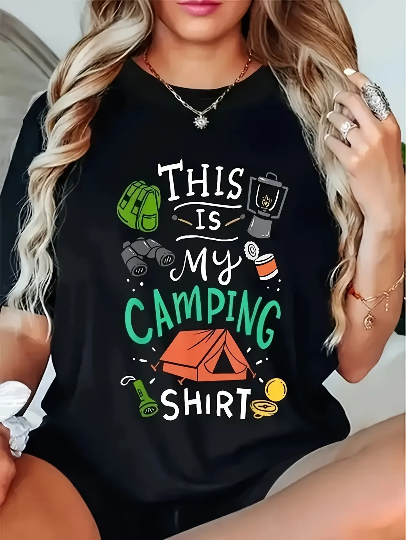 Women's Plus Size Camping Graphic T-Shirt - Short Sleeve Crew Neck Casual Top with Vibrant Cartoon Tent & Campfire Print, Breathable All-Season Outdoor Enthusiast Apparel, Camping Gear, Adventure Clothing, Playful Design, Comfortable Fit