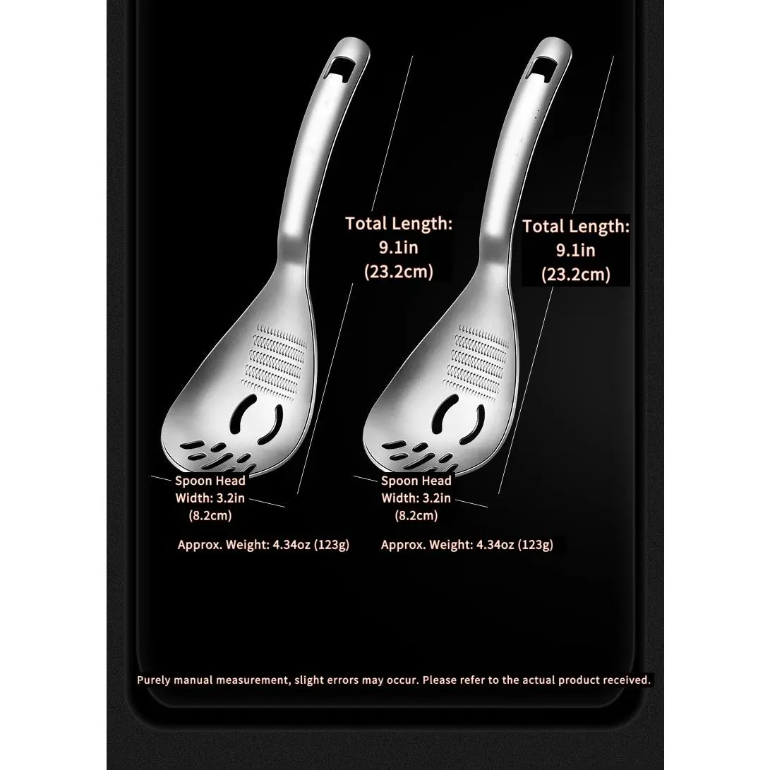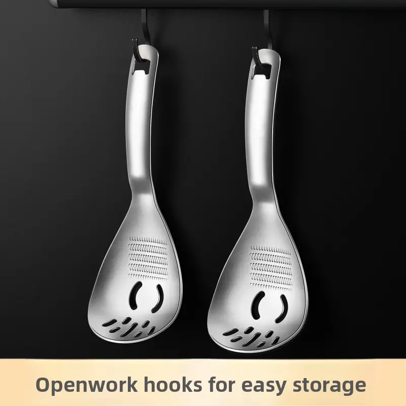·Multi-functional design integrates grating, mashing, straining and egg separating in one spoon.