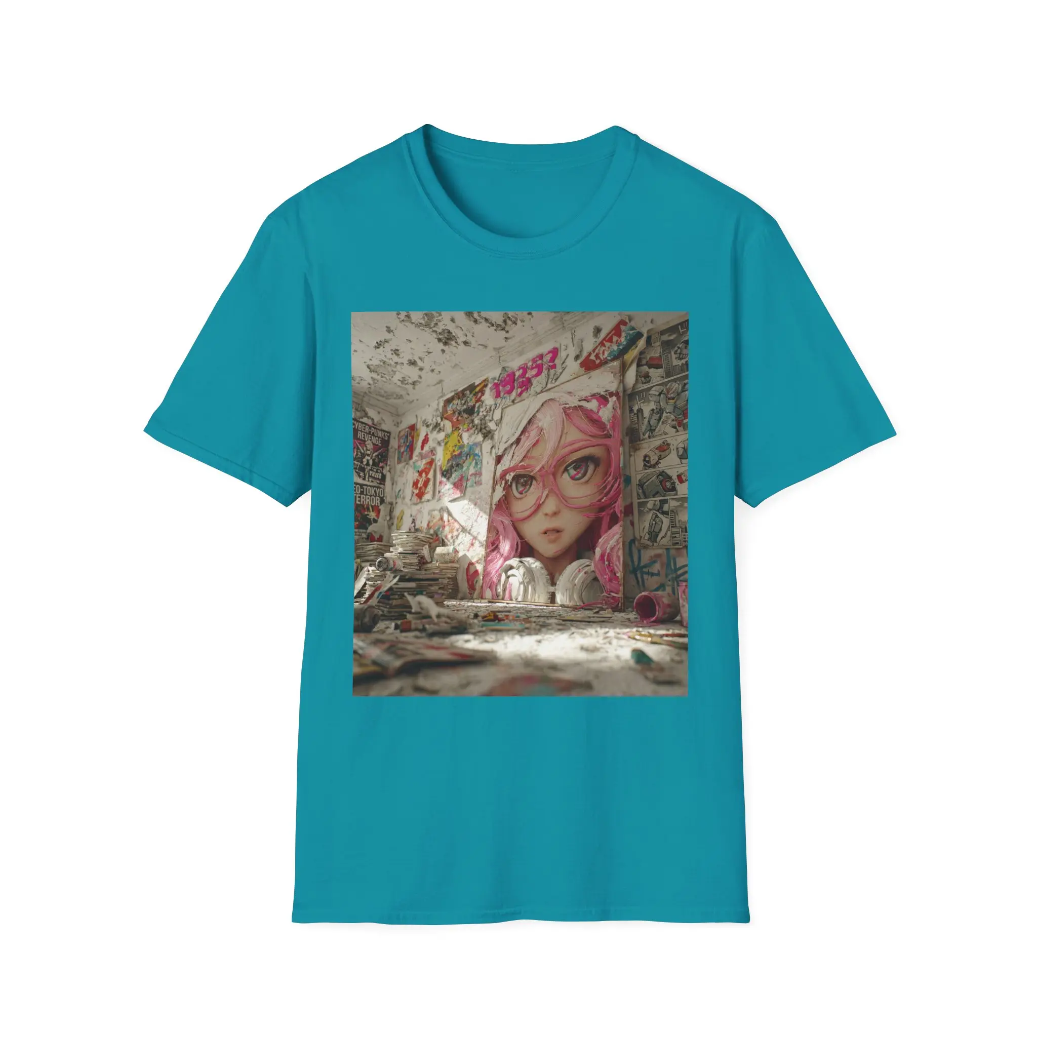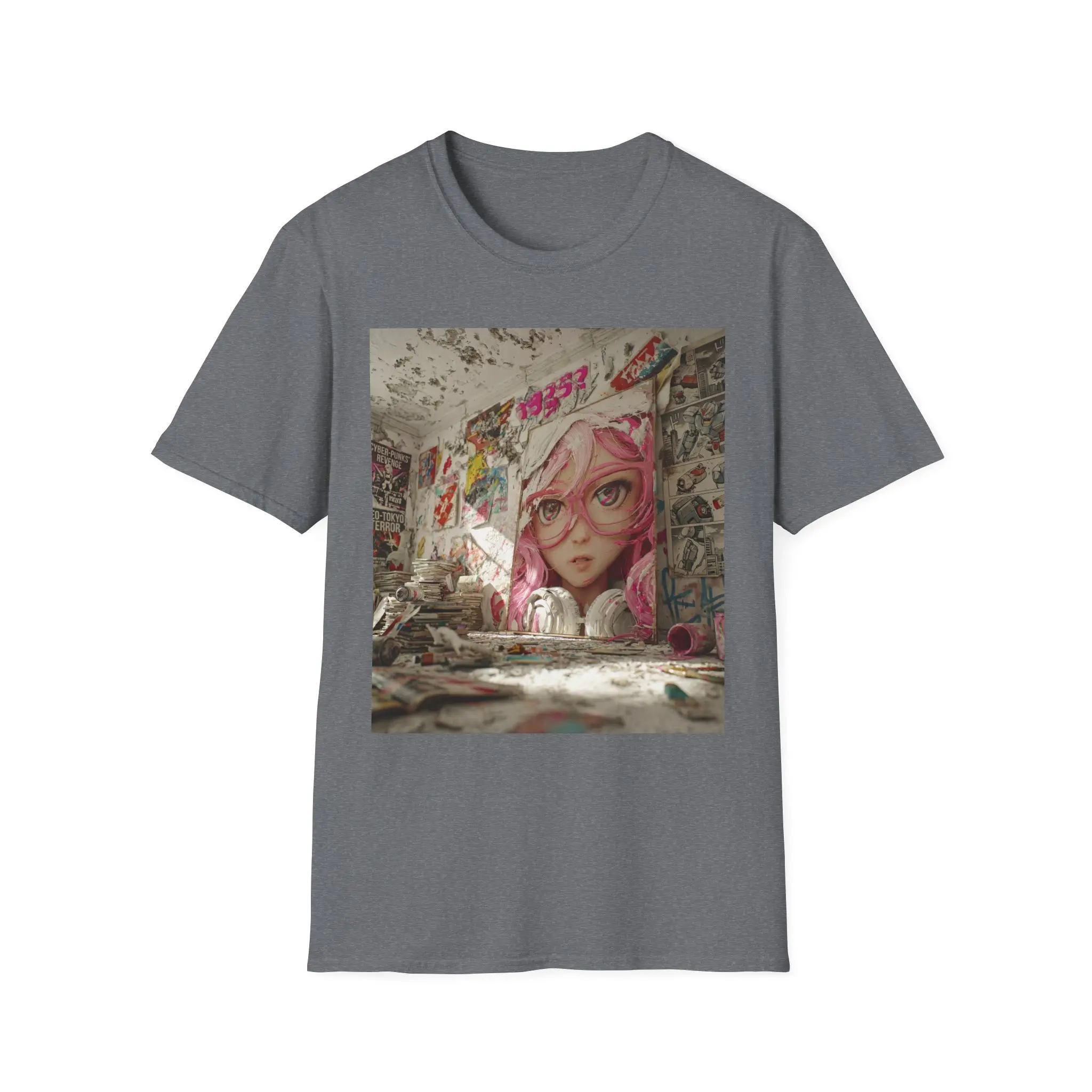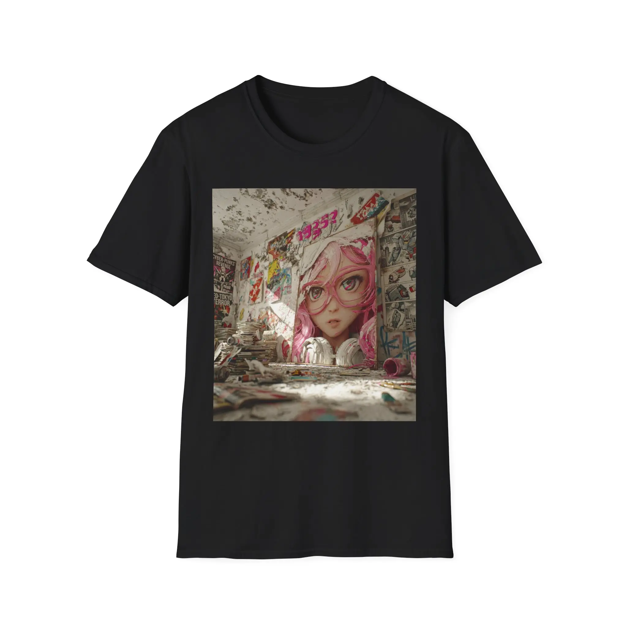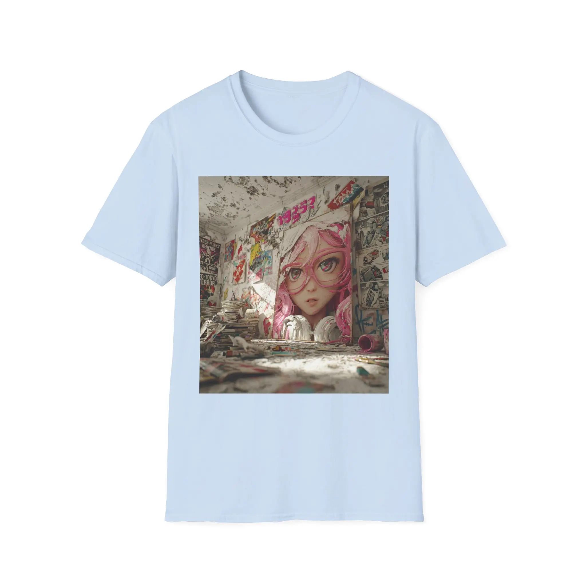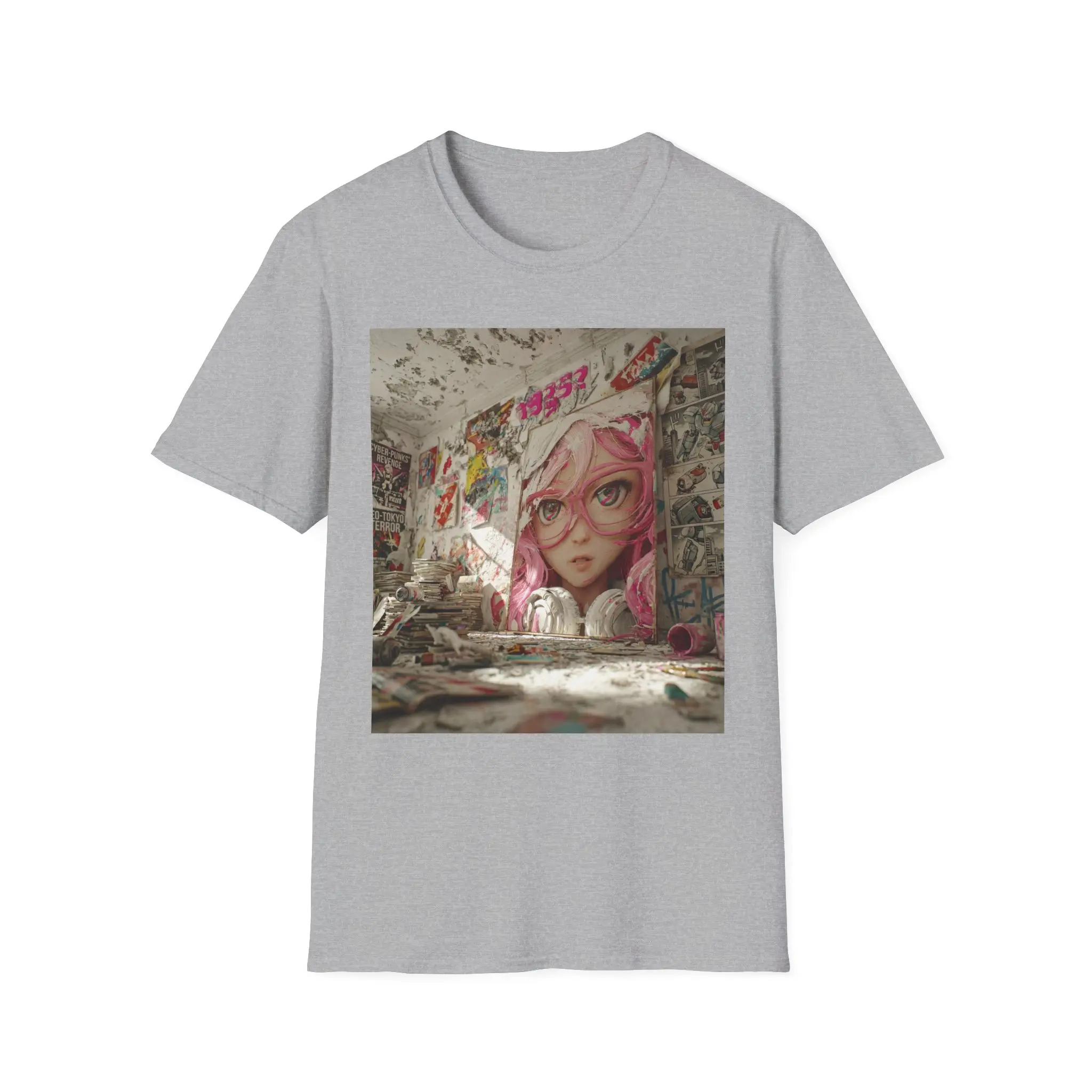 Soft, lived-in, and quietly bold — this tee brings street-art soul to your everyday wardrobe. A large, faded mural of a pink-haired girl stares out from a crumbling wall, splashed with graffiti tags and layered posters. Wear it to carry a fragment of abandoned urban spaces, late-night skate spots, and rainy alleyway colors into bright daylight. The lightweight cotton feels breathable and gentle against the skin, while the square art print sits like a collectible snapshot on the chest. It fits into a creative, city-minded life: layered under a hoodie for alleyway hangs, paired with worn denim for gallery nights, or slipped on for slow morning coffees where you study the city’s textures. This shirt doesn’t shout; it keeps a quiet story on display — nostalgic, a little rebellious, and unmistakably art-first.