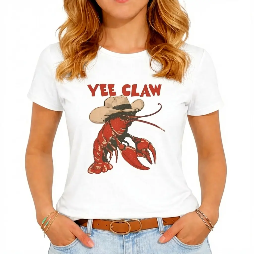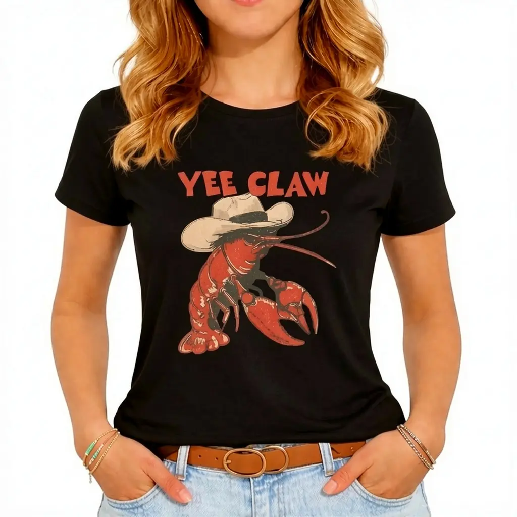 Cowboy Crawfish Vintage Oversized Graphic T-Shirt Beachwear Summer Vacation Western Style Funny Lobster Tee Casual Streetwear Coastal Aesthetic Soft Trendy Outfit Women Holiday Fashion Cute Graphic Tee Comfortable Loose Fit Summer Top Beach Outfit Street