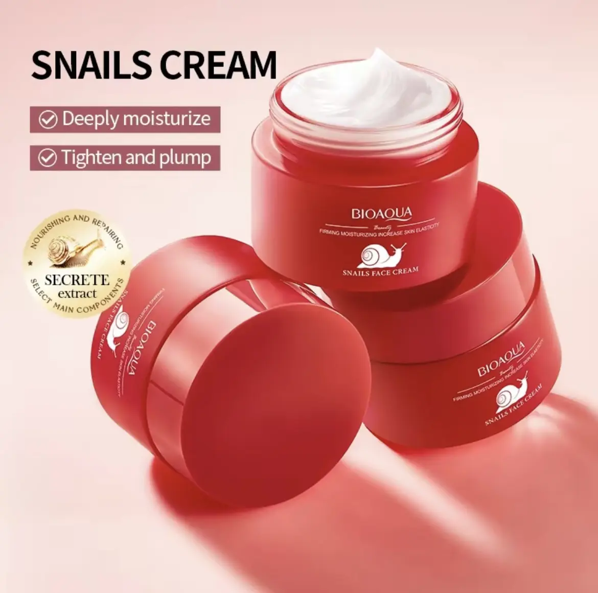 BIOAQUA Snails Face Cream is a daily facial moisturizer infused with snail secretion extract and mineral oil, designed to deliver deep, long-lasting hydration while supporting skin firmness and elasticity. Its lightweight, non-greasy texture absorbs quickly, making it suitable for all skin types, including sensitive skin.