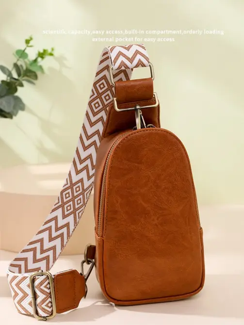 Women Chest Bag Sling Bag, Guitar Strap Small Crossbody PU Leather Satchel Daypack