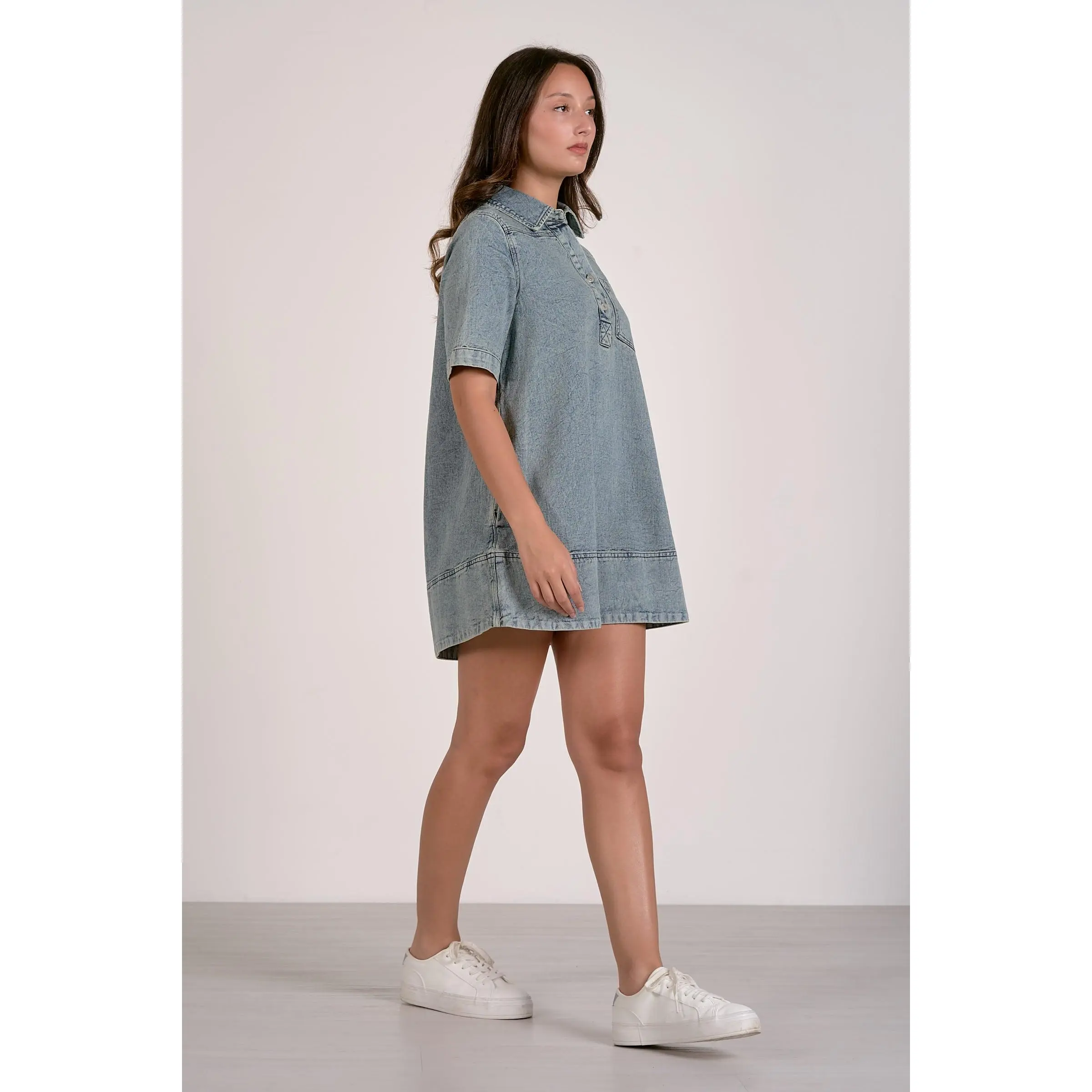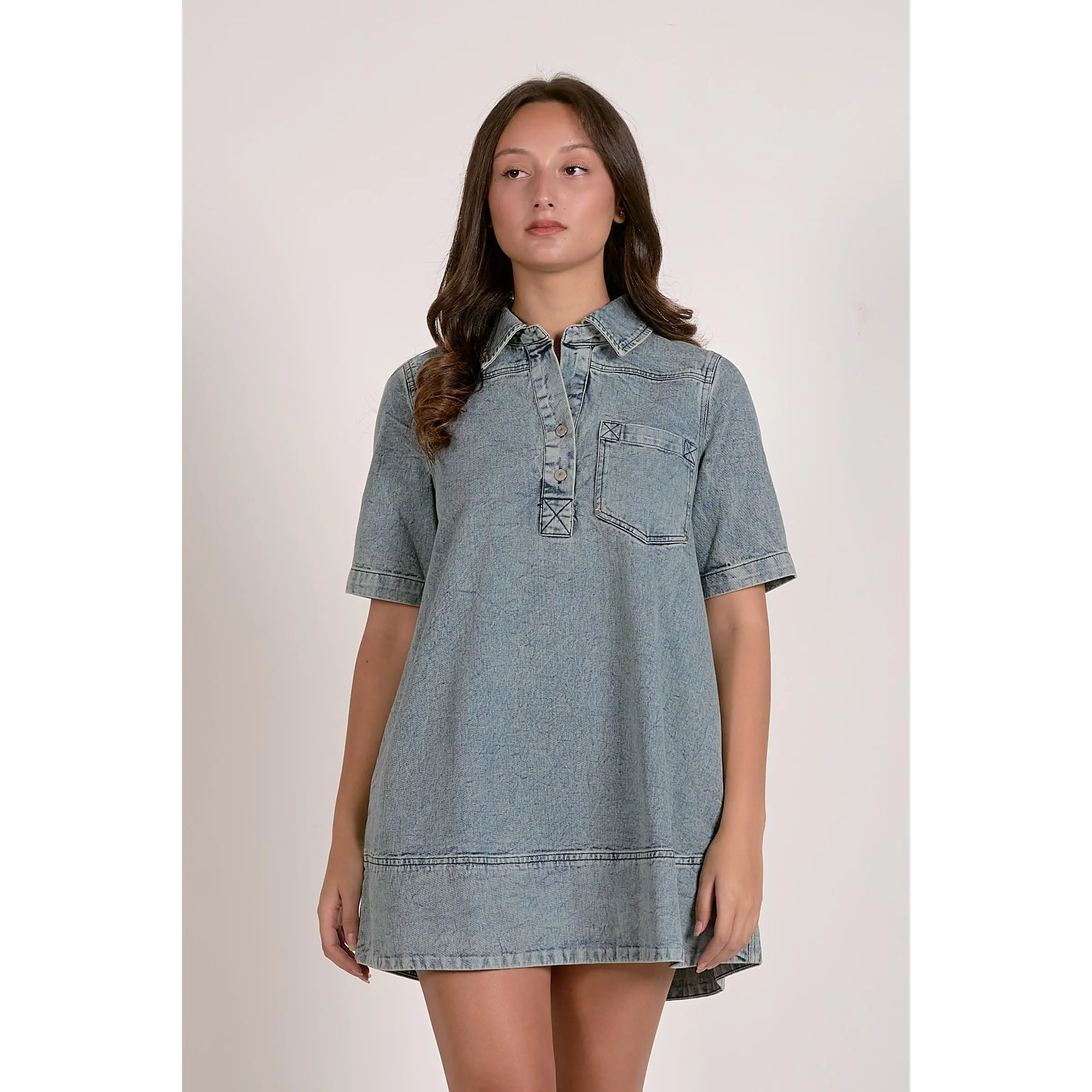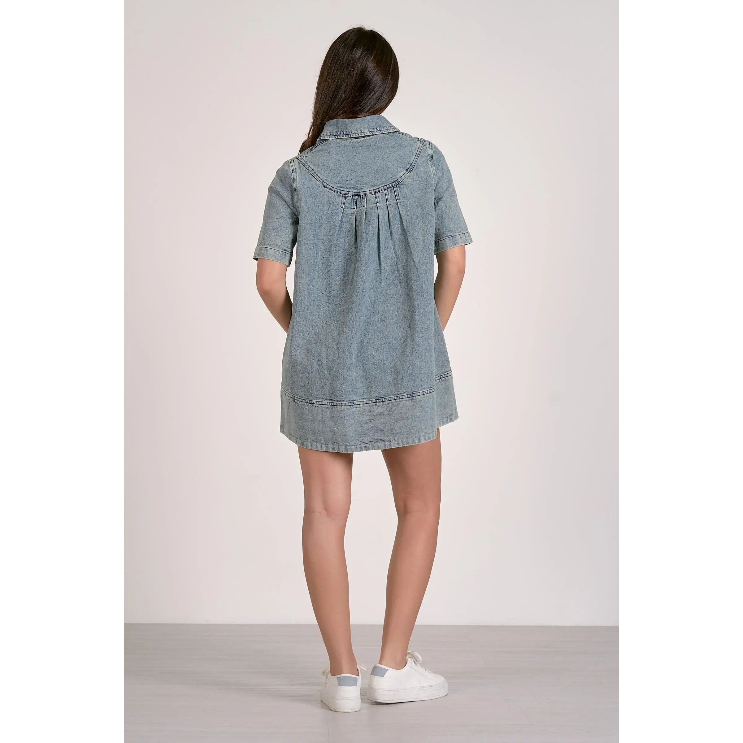 The Elan Denim Dress is crafted from high-quality denim, known for its durability and resistance to wear. This fabric composition ensures a long-lasting garment that maintains its appearance over time. Ideal for versatile styling, the dress can be paired with various accessories for different occasions.
