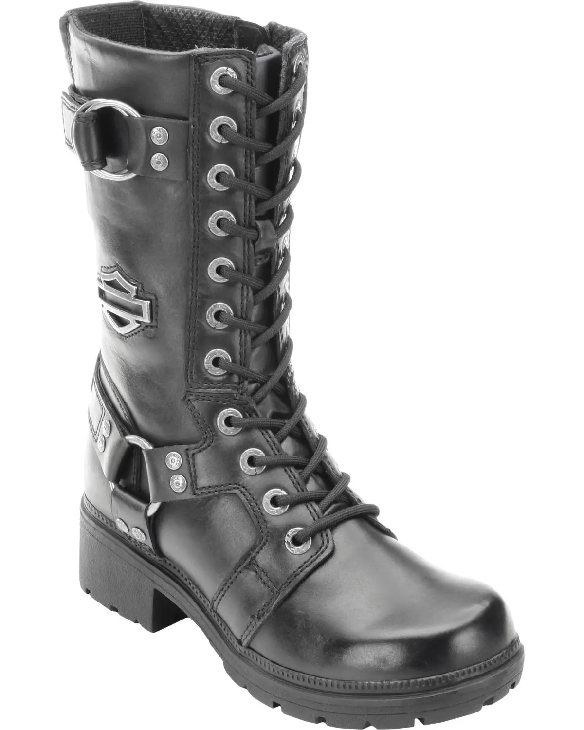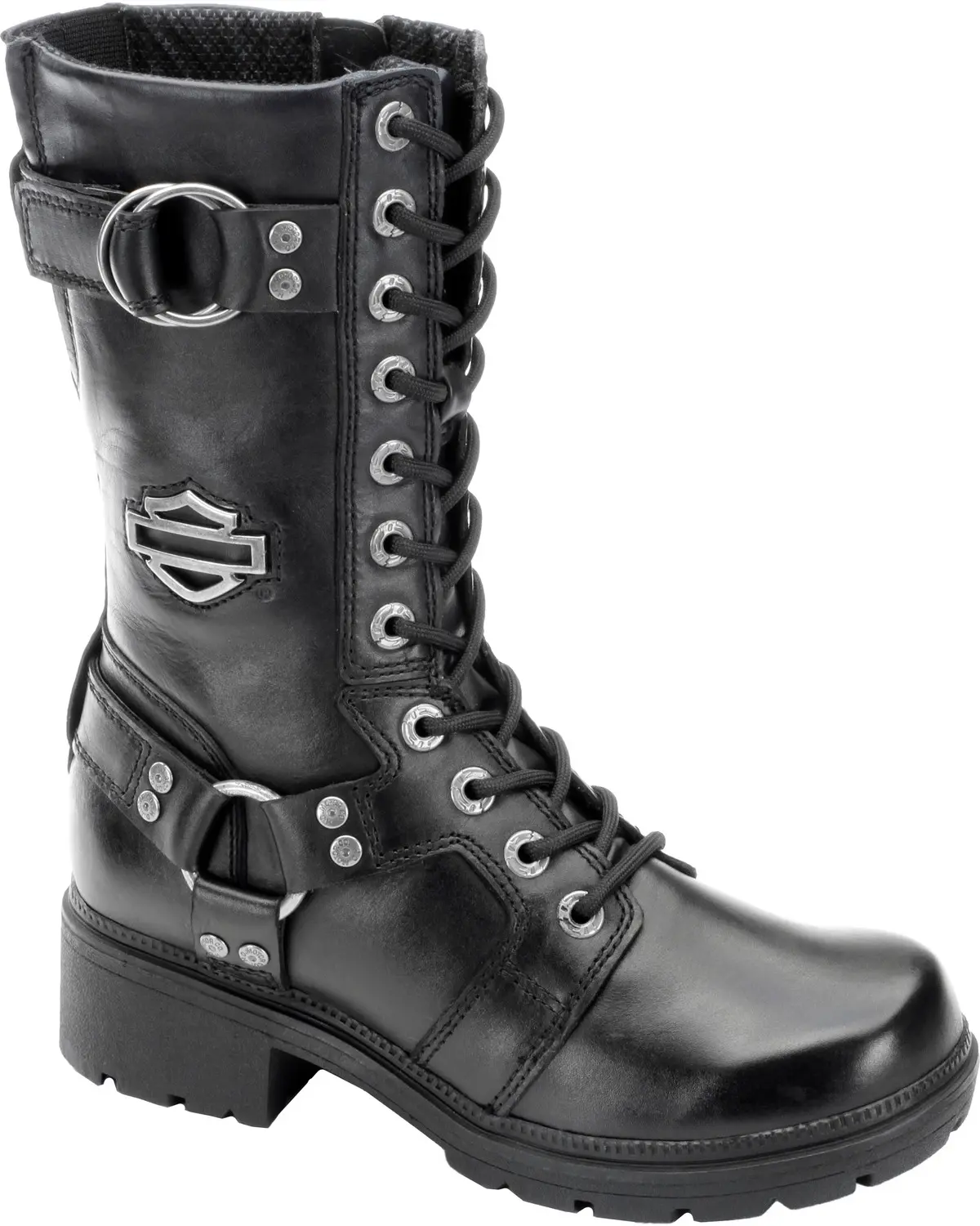 Genuine smooth full-grain leather upper with lace-up closure. 1 3/4" heel height. 10 1/2" shaft with metal studded harness straps on ankle and collar. Textile lining provides breathable comfort. YKK side zipper for easy on and off. Clincher® Compound outsole is oil-, abrasion-, and slip-resistant. Cement construction for strength and durability.