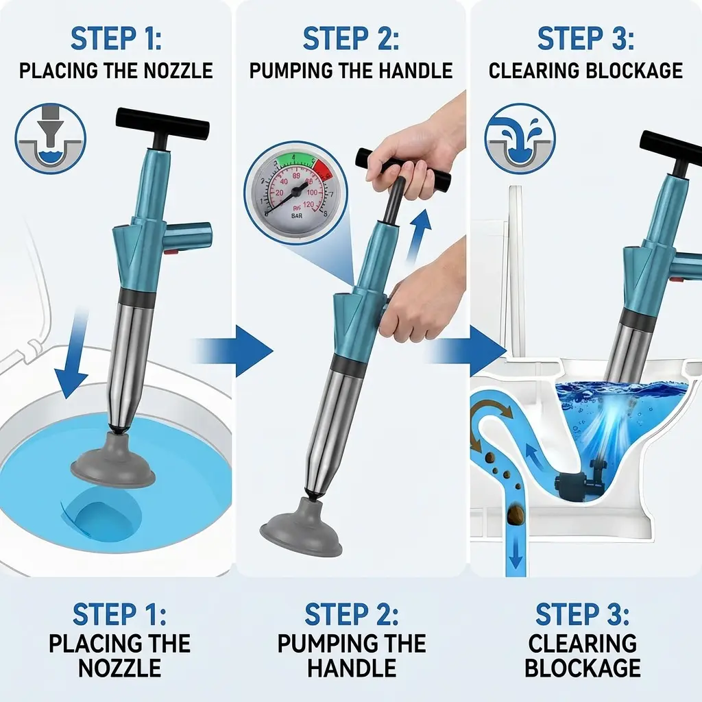 Uses high-pressure air compression to break through tough clogs instantly. Much stronger and faster than traditional plungers, making drain cleaning effortless.