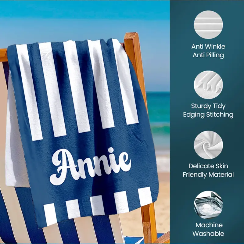 【PERSONALIZED CUSTOM NAME】: Add your custom name (like Annie) to this classic striped beach towel, a timeless summer accessory for kids, teens, and adults.