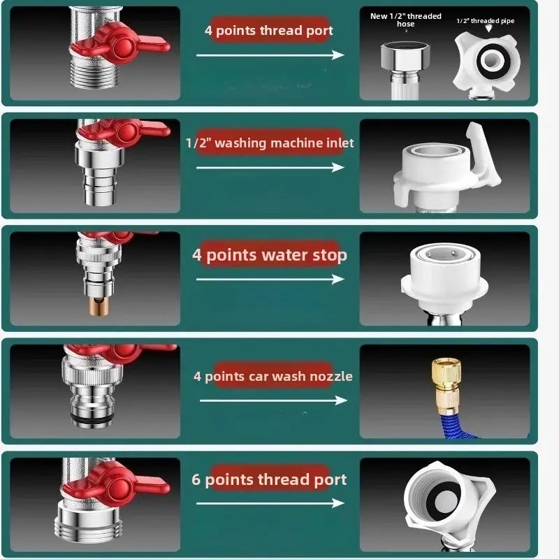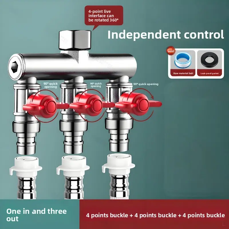 No need to disassemble the original faucet. Washing machine faucet splitter, one inlet three outlets with switch, 6-point quick-install buckle water diverter valve