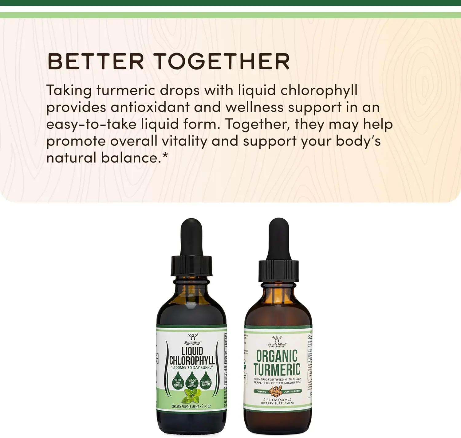 ·DROP IN WATER AND OTHER LIQUIDS: Double Wood's Chlorophyll can easily be added to your water, smoothie, juice or any other liquid you consume in the mornings
