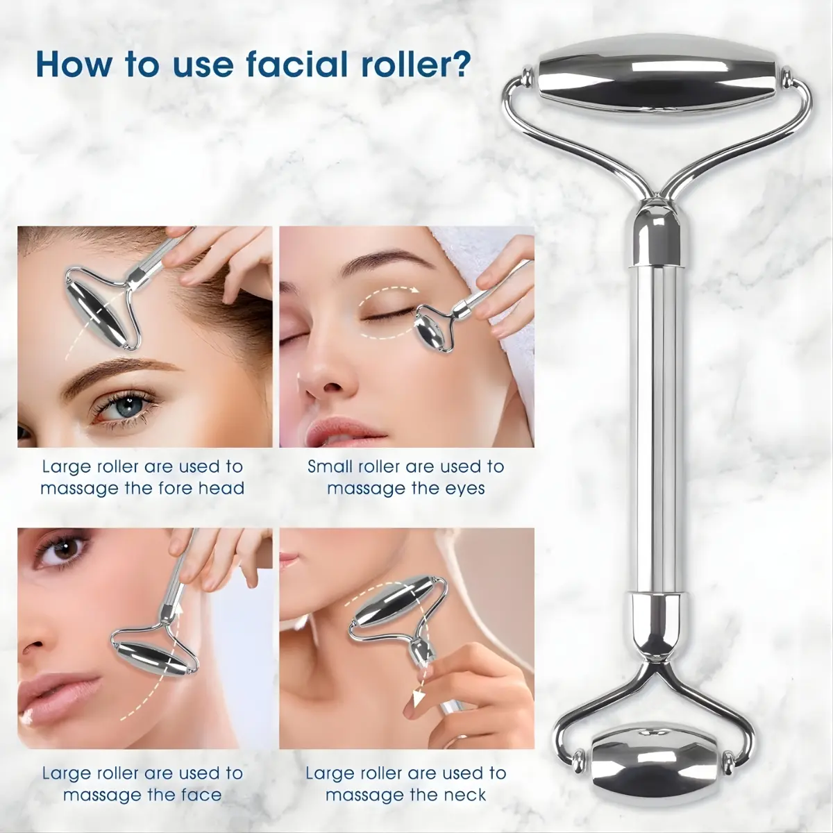 Upgrade your skincare routine with this Premium Stainless Steel Face Roller & Gua Sha Set, designed to deliver a spa-like facial massage at home. Made from high-quality 304 stainless steel, this durable and hygienic skincare tool helps improve skin texture, reduce puffiness, and enhance natural glow. The naturally cooling surface soothes the skin instantly and can be chilled in the refrigerator for an even more refreshing experience.