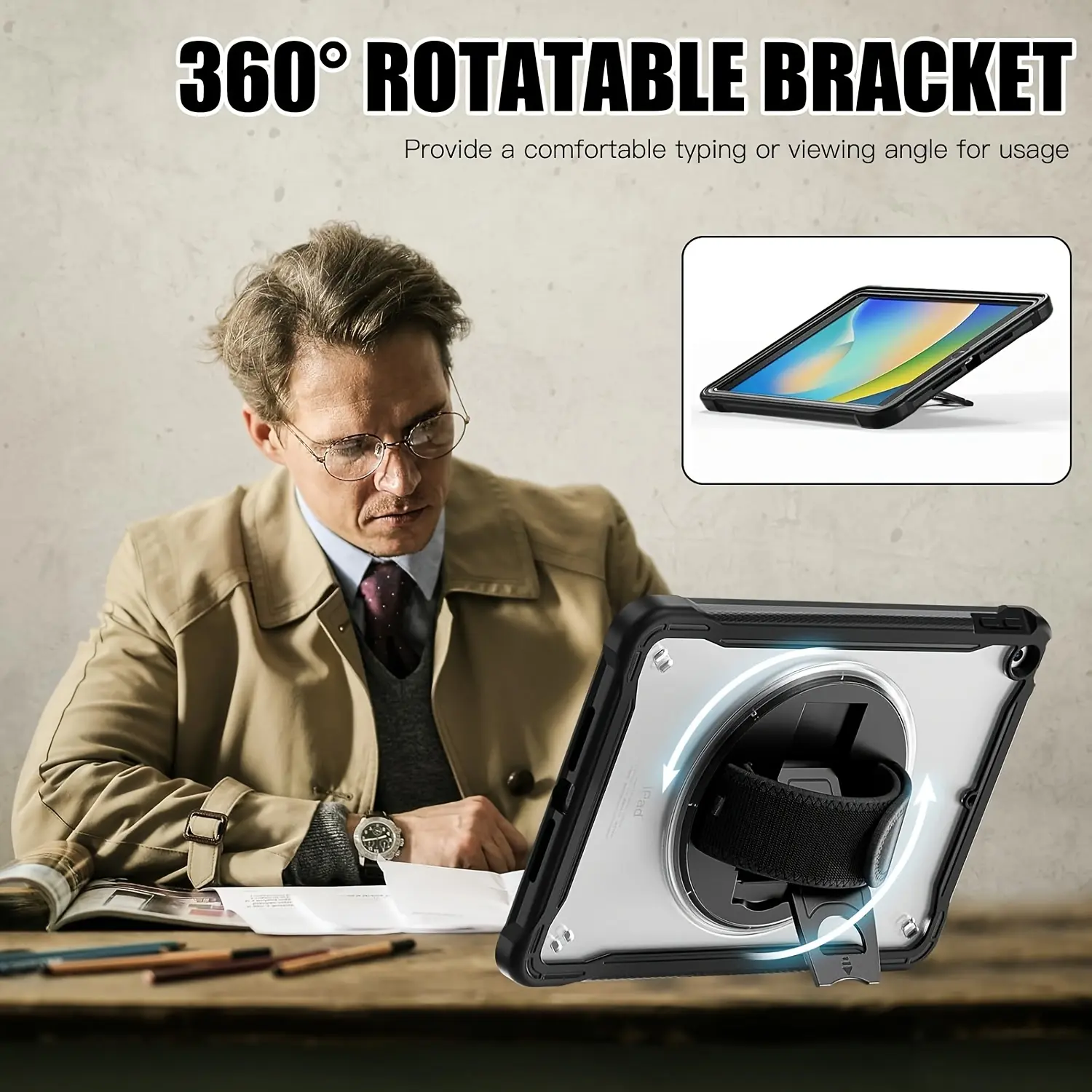 Safeguard your iPad 9th/8th/7th generation (10.2-inch, 2021/2020/2019) in style with this clear case! It provides all-around protection against scratches and drops while showing off your device's sleek design. The included tempered glass screen protector ensures your display stays pristine. With a built-in kickstand, enjoy hands-free viewing for movies or video calls. Plus, the convenient pencil holder keeps your Apple Pencil secure, and the hand/shoulder strap offers easy portability.