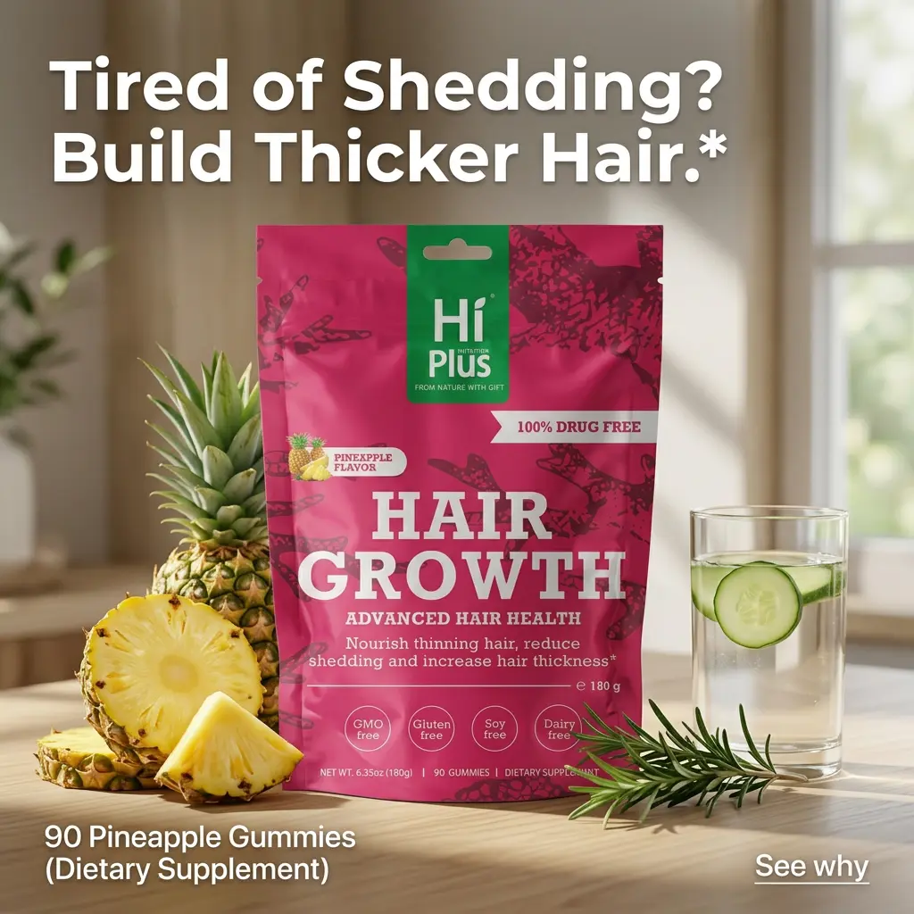 Tired of brittle strands and thinning hair?HiPlus Hair Gummies are expertly formulated with a powerful blend of Collagen, Biotin, and essential vitamins to nourish your hair at the root.Designed for the modern woman, our gummies help reduce breakage and promote a healthier, more vibrant look you can feel confident about.