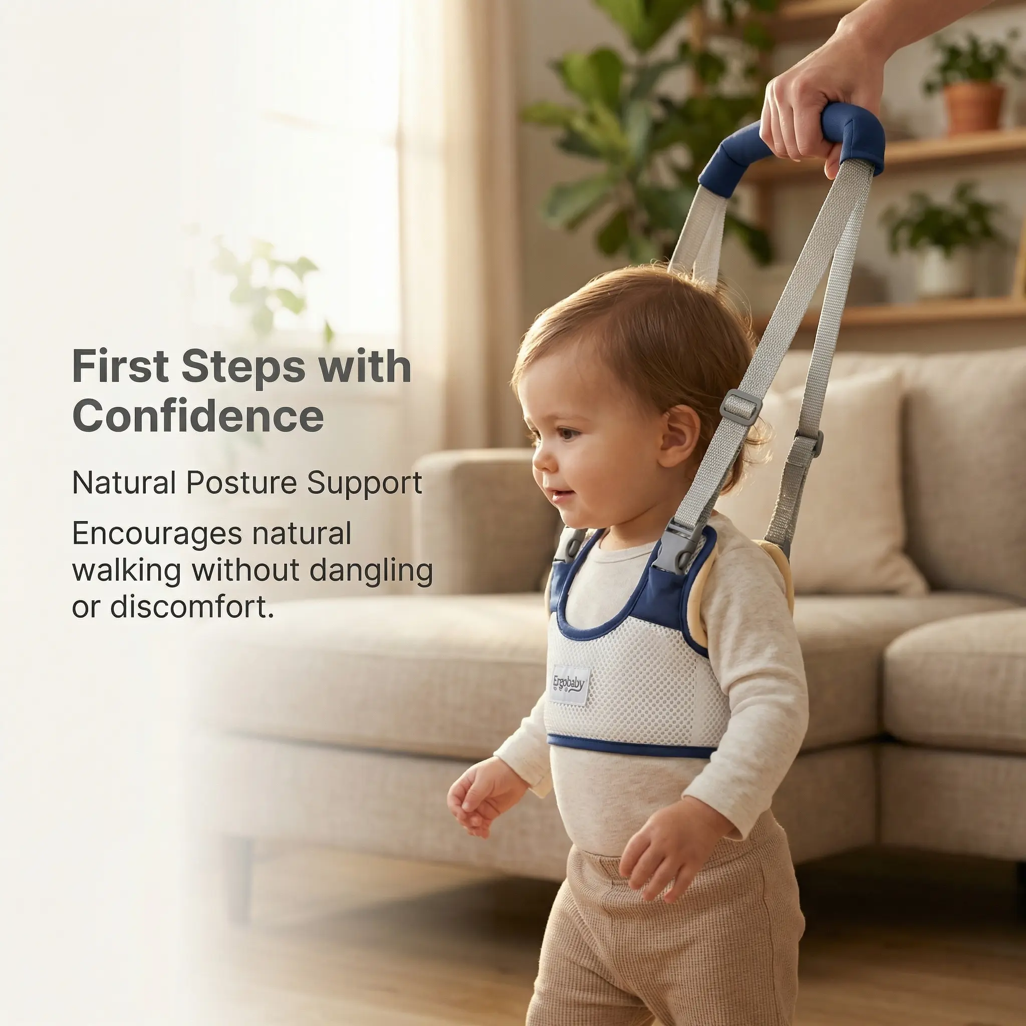 This infant walking aid helps babies aged 8 months and older learn to stand and walk. It reduces parental back strain and discomfort. Simply fasten the support vest around the baby's upper chest, just below the armpits. Adjust the handle straps or grasp the base for assistance. It keeps parents' hands free while helping babies maintain balance.