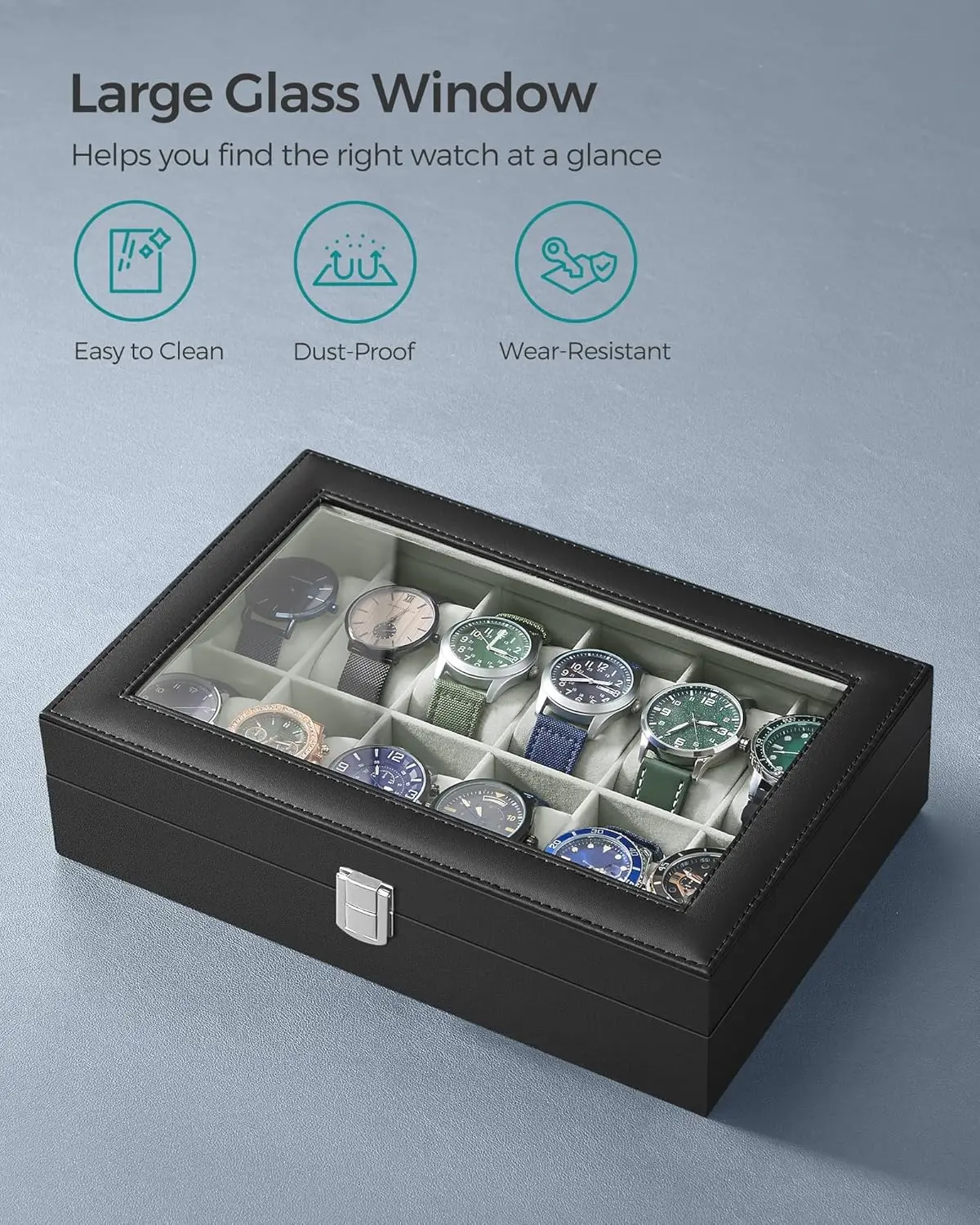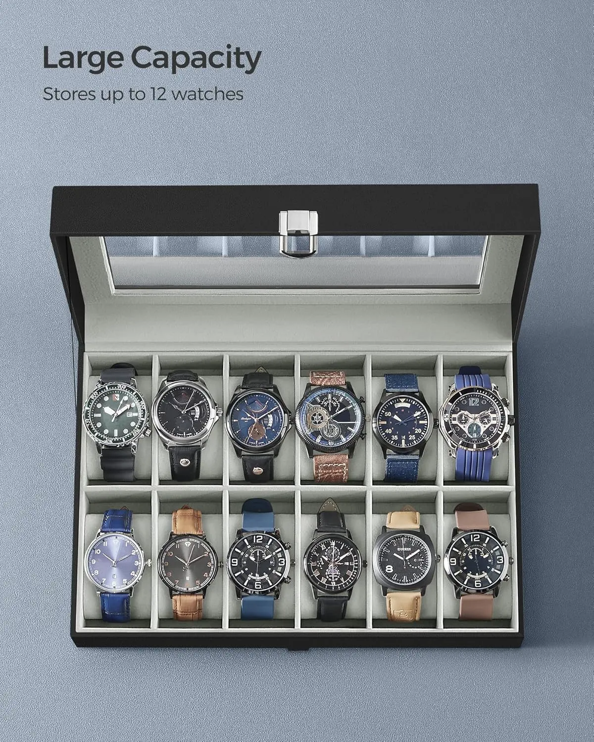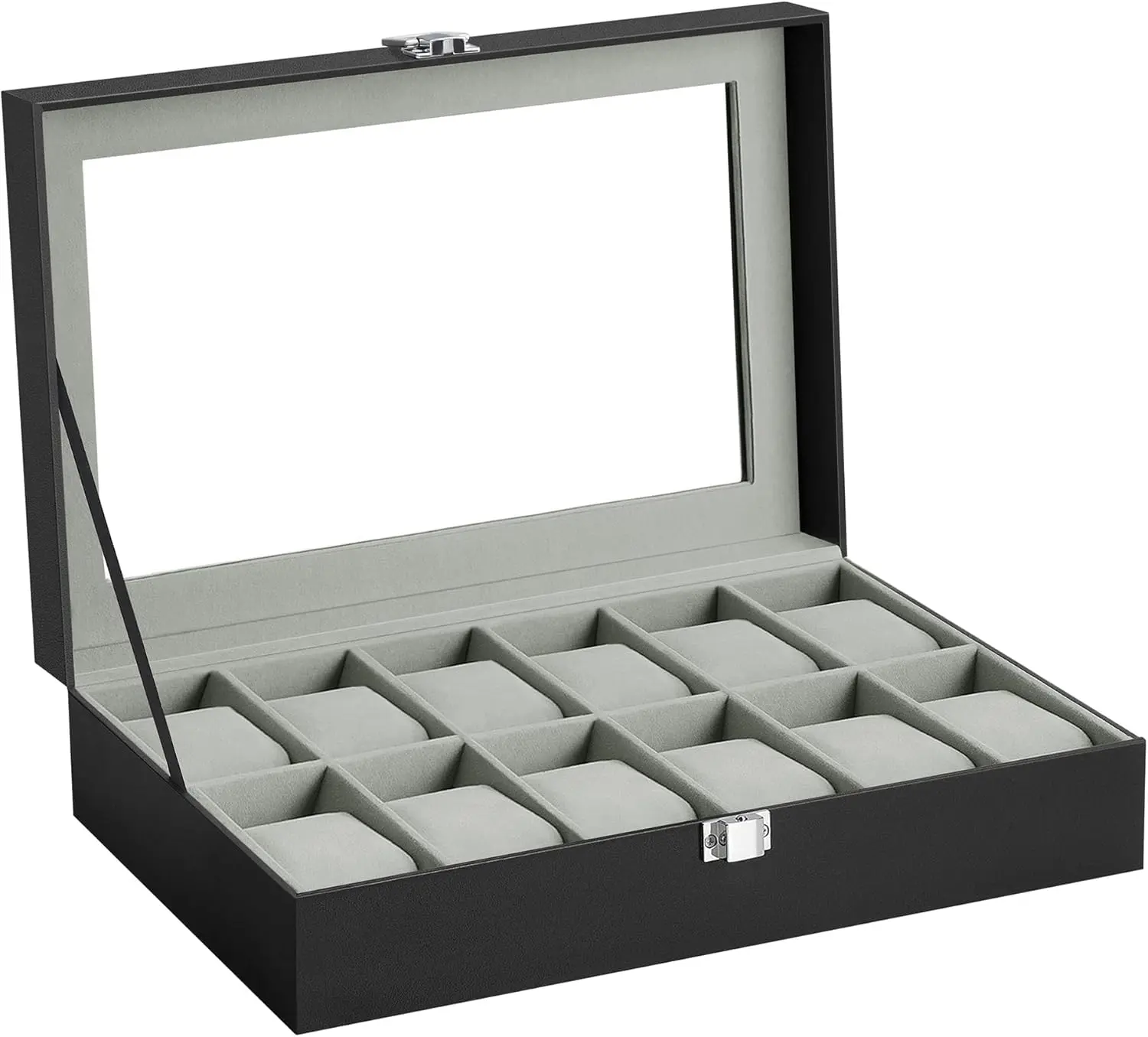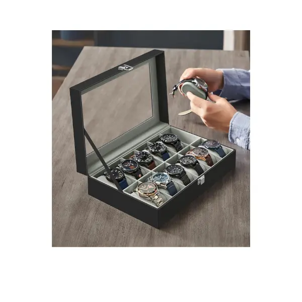 This watch box features a sleek black synthetic leather finish. It's perfect for organizing your collection of watches. The box includes 12 slots, ensuring each watch has its own space. A large glass lid protects your watches from dust and damage. This organizer is not just functional but also a thoughtful gift for loved ones.