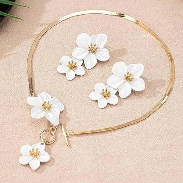 Elevate your jewelry collection with our Flower Necklace Earrings Set, combining a delicate flower pendant necklace and matching statement earrings. This versatile set is ideal for both casual outings and special occasions, offering a cohesive and stylish look.