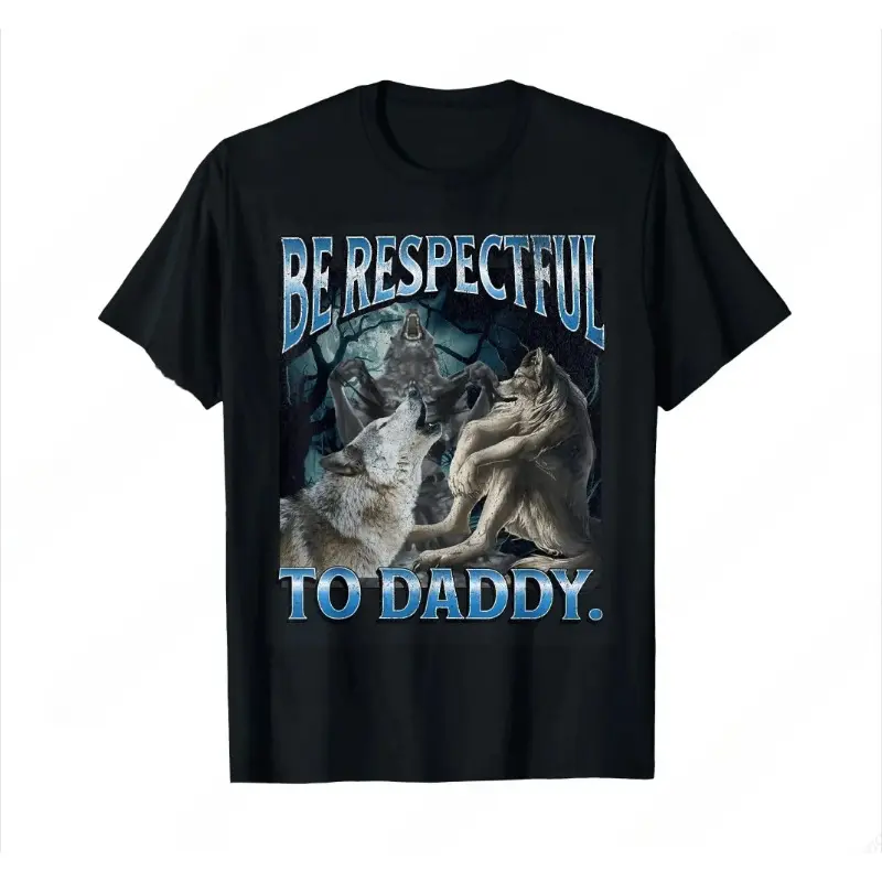 Viral Be Respectful To Daddy Alpha Wolf Sigma Male Meme Men's Oversized Graphic T-Shirt | Funny Alpha Male Werewolf Dad Joke Streetwear Bootleg Novelty Tee