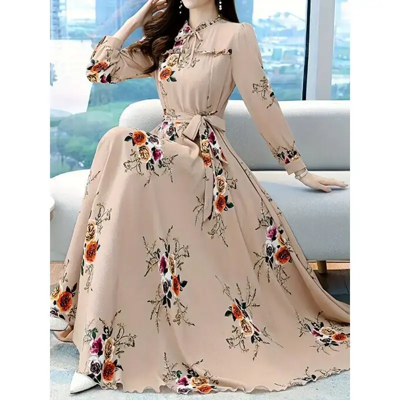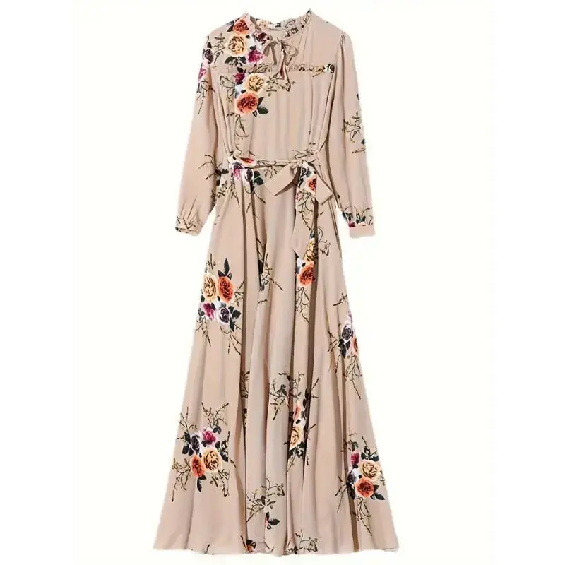Long-sleeved dress, velvet-free V-neck - Elegant floral prints, ladies lace details, suitable for spring/autumn parties
