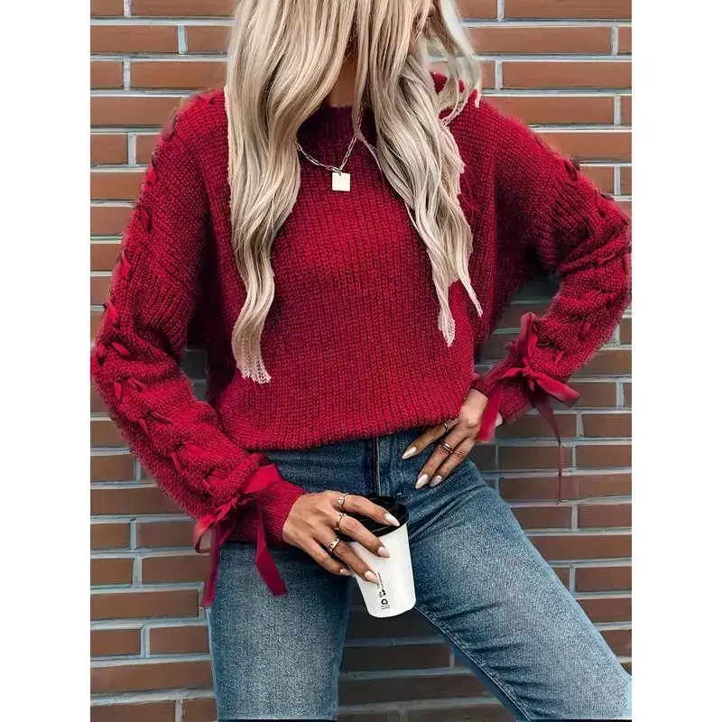 Women'S Soft Pink Oversized Bow Sweater - Cozy Loose-Fit Long Sleeve Round Neck Winter Sweater with Medium Stretch, Layering Essential for Casual & Semi-Formal Outfits, Warm Winter Sweater for Women, Soft Pink Sweater for Fall and