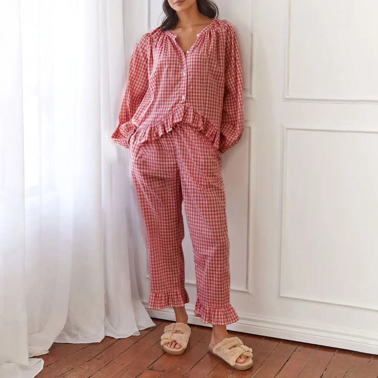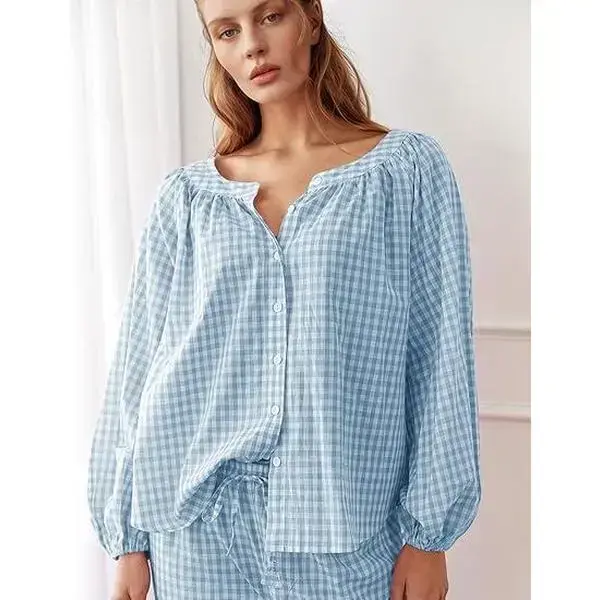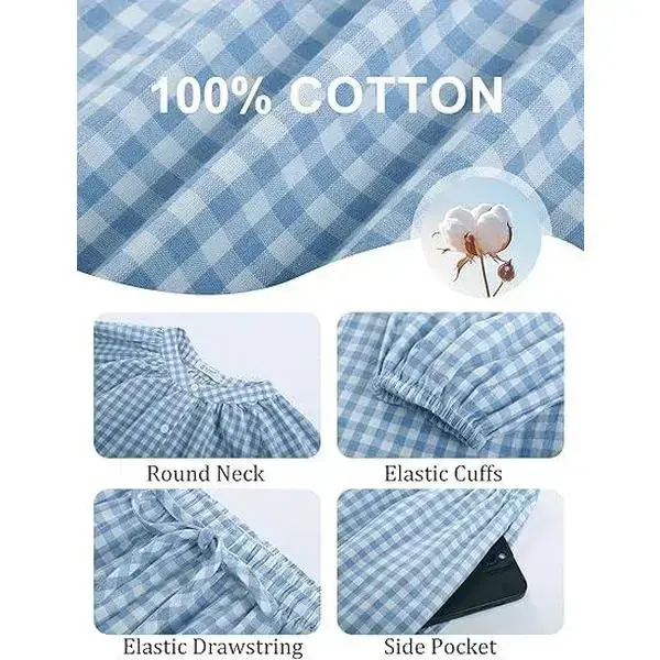 Womens Gingham Pajama Set 2 Piece Cotton Plaid Shirt and Pants 100% Premium Cotton �C Breathe Easy, Sleep Better Classic Buffalo Check More Than PJs, A Cozy Fall Top and Pants, You��ll Wear All Day. We Run True to Size! PS: These PJs are meant to be snug but not tight. When in doubt, size up for a looser feel! About this item: [100% Cotton Pjs]: Women��s pajama set is crafted from 100% premium pure cotton, offering softness with a touch of elasticity. It boasts excellent moisture absorption and breathability, ensuring gentle, irritation free comfort that��s kind to the skin, perfect for expectant mothers. Enjoy year round coziness and effortlessly create a sense of relaxation and style with this y2k set. [Pajama Plaid Top]: Classic women's pajama features a round neckline with button up design for easy on and off. The combination of puff sleeves and raglan sleeves not only provides freedom of movement but also enhances the design aesthetic, ensuring unrestricted comfort during sleep. The elastic cuffs on the long sleeves securely hold their position, keeping warmth in and preventing stains while eating or skincare, achieving an optimal balance of comfort, functionality, and aesthetic appeal. [Pajama Gingham Bottom]: These matching sleep pants feature a relaxed straight-leg cut that visually elongates the silhouette while eliminating constriction. The adjustable drawstring waist accommodates all body types, solving the common issues of tight elastic bands or slipping waistbands. Practical side pockets securely hold essentials like your phone, while the ankle-length design prevents tripping hazards and enhances an effortlessly relaxed chic vibe [Occasions]: Y2K pajamas perfect for everyday wear, sleeping, maternity nursing use, weddings, bridal or bridesmaid loungewear, travel, bedroom, slumber parties, spa days, Valentine's Day, girls day, and honeymoon getaways. They're equally perfect for leisurely balcony moments with coffee or tea. Pj set is an ideal gift for wife, girlfriend, or daughters during holidays and special occasions. [Warm Tips]: This package includes a color coordinated long sleeve pajama top with wide leg pants, offering effortless coordination that saves you time getting dressed. Crafted from 100% premium cotton, we recommend gentle machine washing in cold water or hand washing to maintain quality, followed by air drying to preserve the fabric's softness and shape.