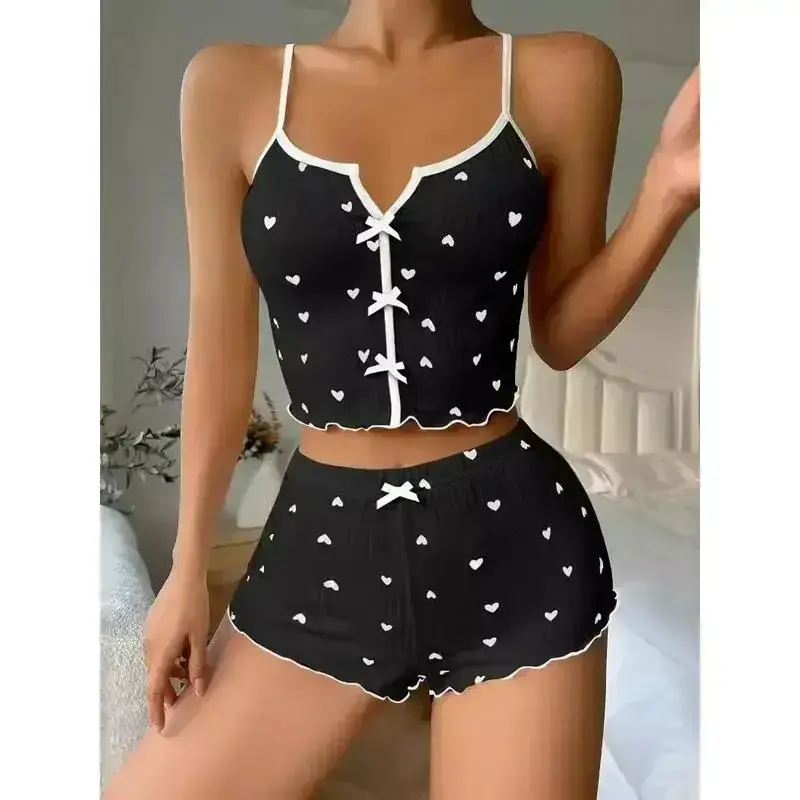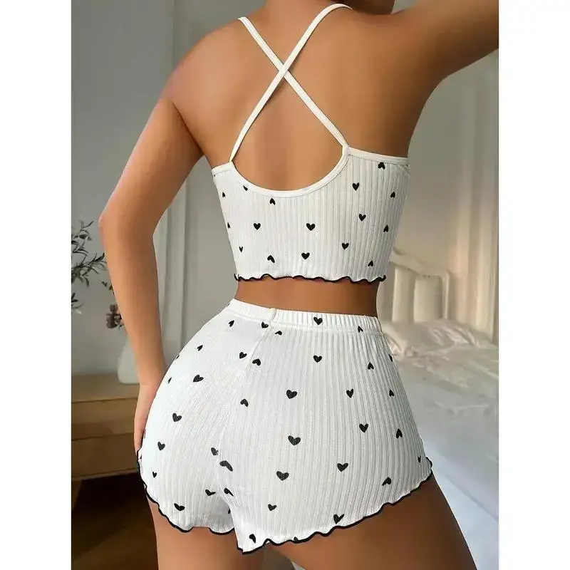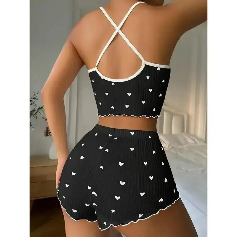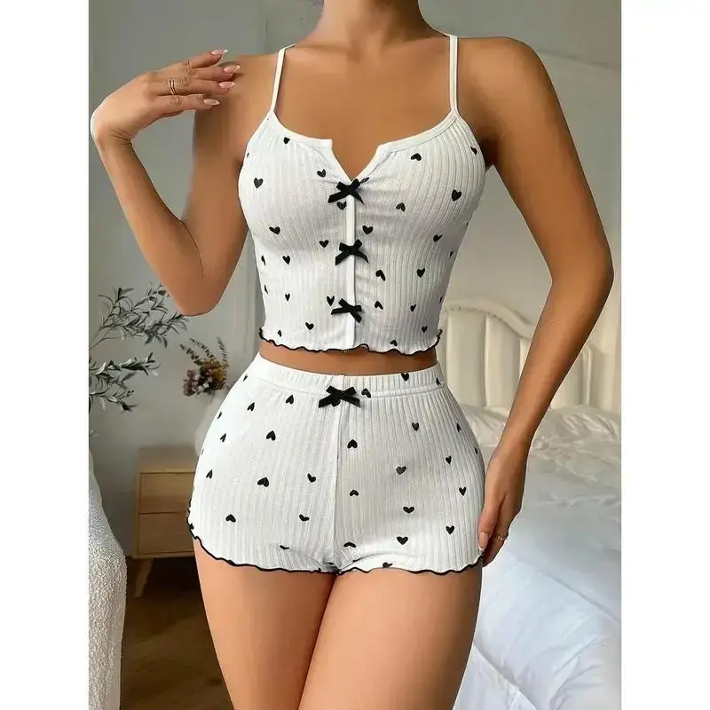 Heart Print Pajama Set for Women Sleepwear Soft Ribbed Fabric Casual Cami Tops and Shorts Pijamas Sets Loungewear