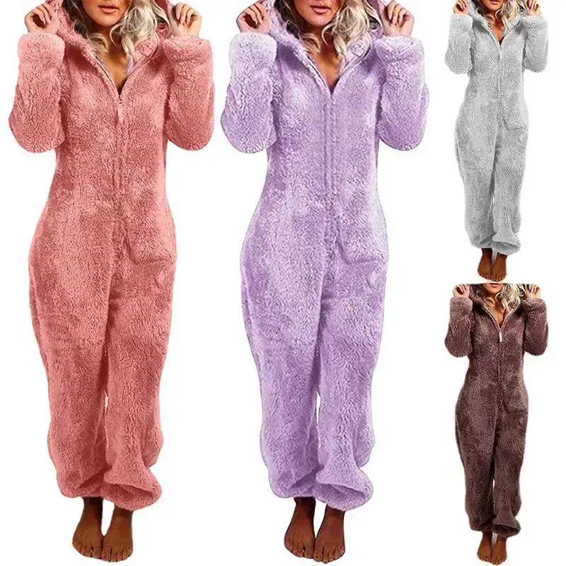 Women White Hooded Pajama Jumpsuit Long Sleeve Zipper Pajamas Lady Sleepwear(gift)