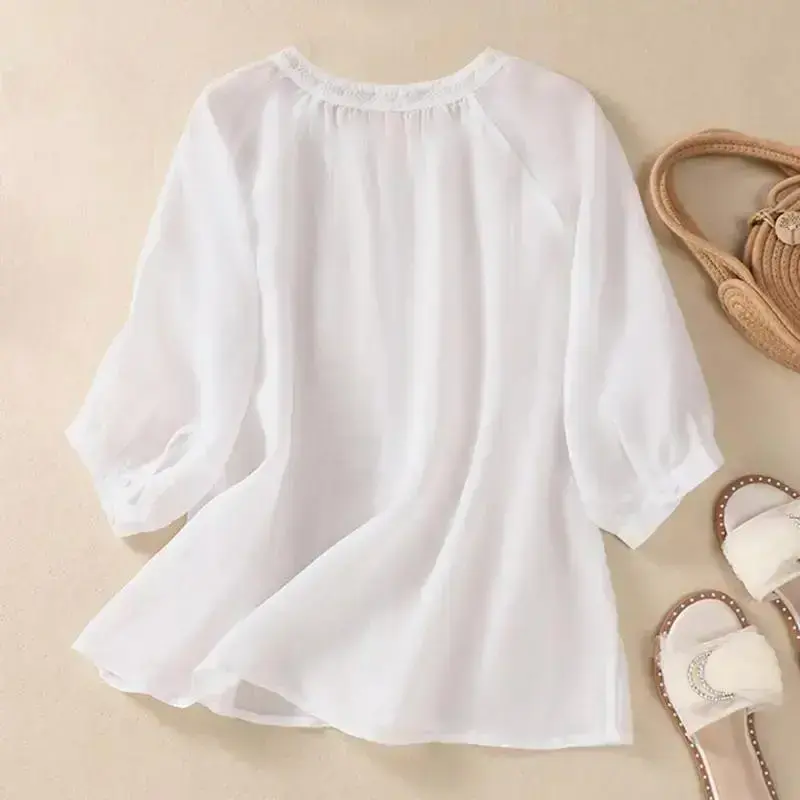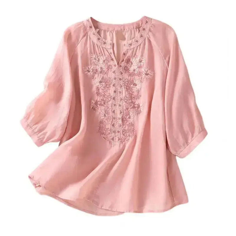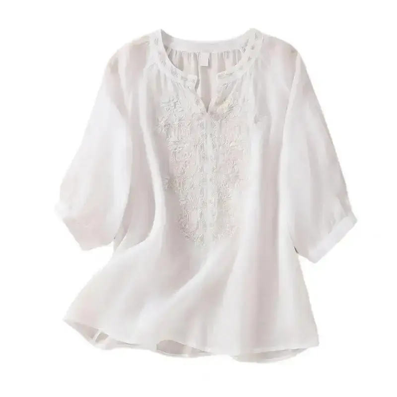 Cotton Linen Flower Embroidery Shirt Three Quarter Sleeves V Neck Casual Blouse Loose Solid Color Mother Blouse Top Comfort Embroidered summer clothes women anji shoe