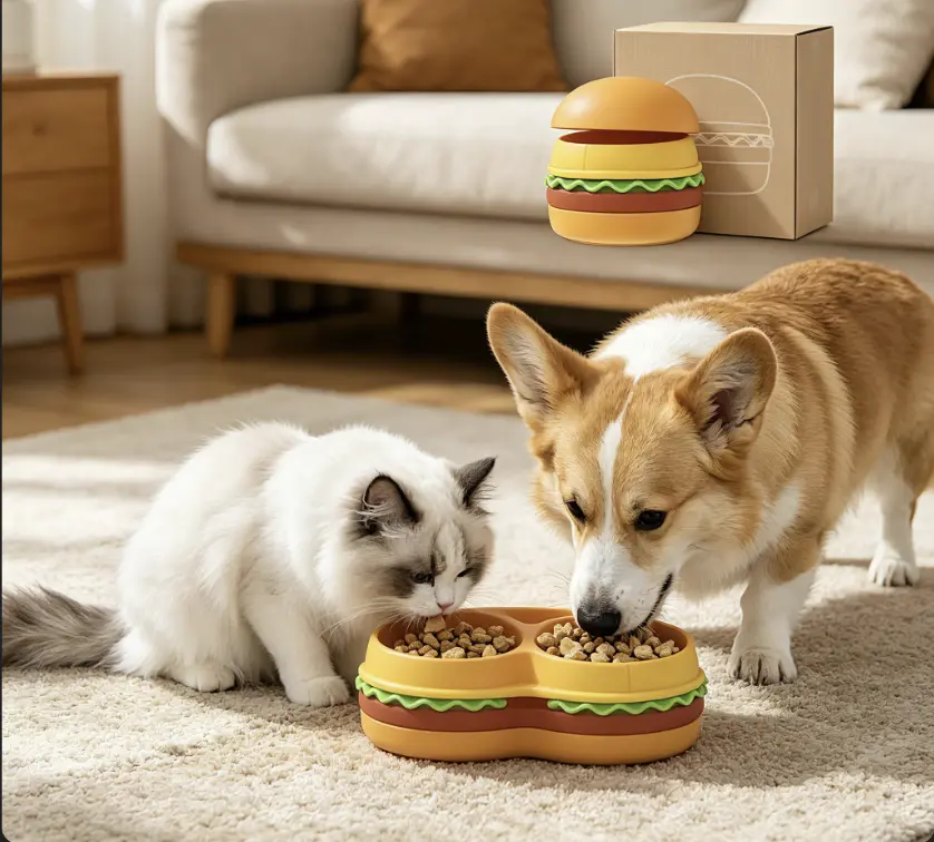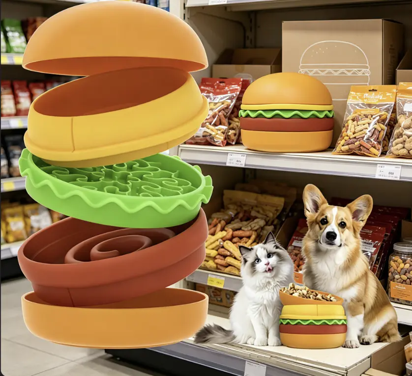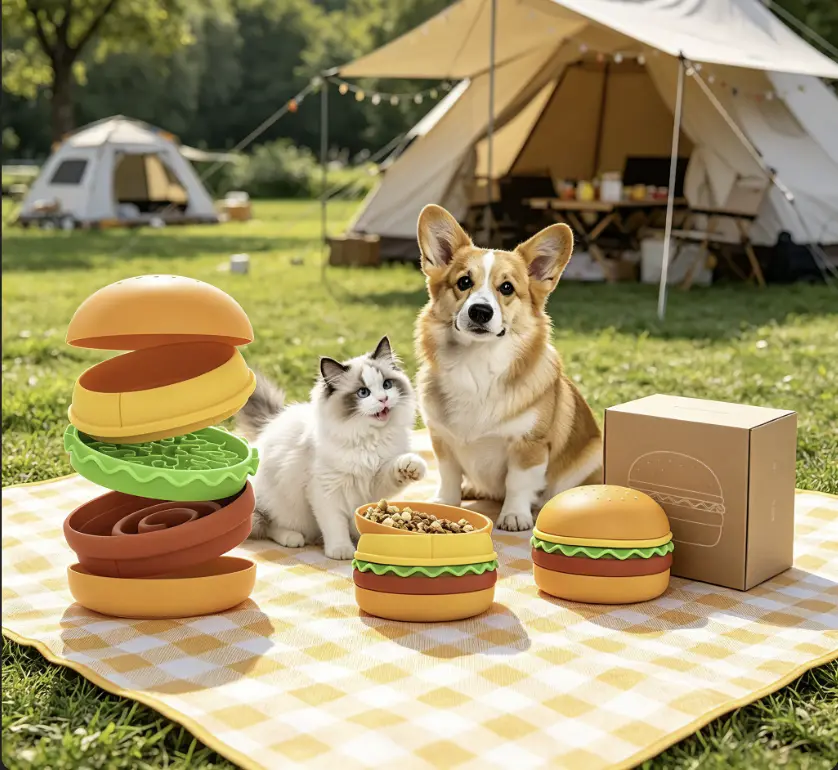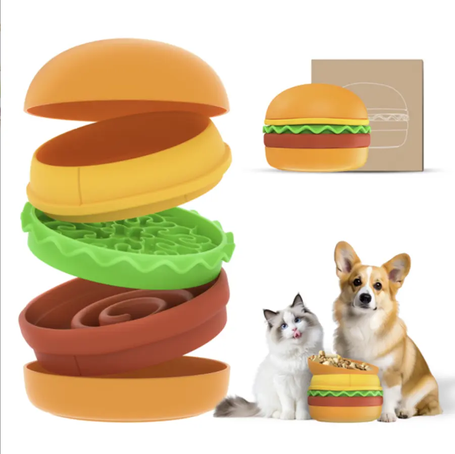 This 15×15×12cm 5-in-1 hamburger-shaped pet bowl set integrates five practical functions: tilted bowl, adjustable raised bowl, slow feeder bowl, licking mat and non-slip bowl. The ergonomic tilted and liftable design eases neck pressure on cats and dogs, protecting their cervical spine during daily feeding. The slow-feeding structure prevents overeating, choking, bloating and indigestion, while the licking mat relieves pet anxiety and releases stress effectively. Equipped with a firm non-slip base, it avoids sliding and food spilling for stable use. Made of premium food-grade safe material, it is BPA-free, durable, detachable and easy to clean. Compact and portable, it suits indoor daily meals, outdoor travel and multi-pet feeding, bringing a healthier, more comfortable and fun dining experience to your lovely pets.