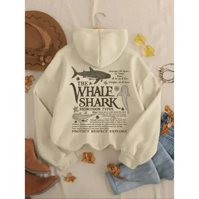 Women's Casual Homewear Hooded Sweatshirt with Ocean Life Whale Shark Print, Loose-Fitting Stylish Pullover for All Seasons, Autumn Winter Clothing