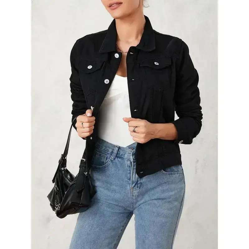 Women's Solid Color Denim Jacket - Casual Long Sleeve Button-Down with Chest Pocket Jean Jacket Basic Womenswear Piece Tops Chic Coats Cotton Everyday