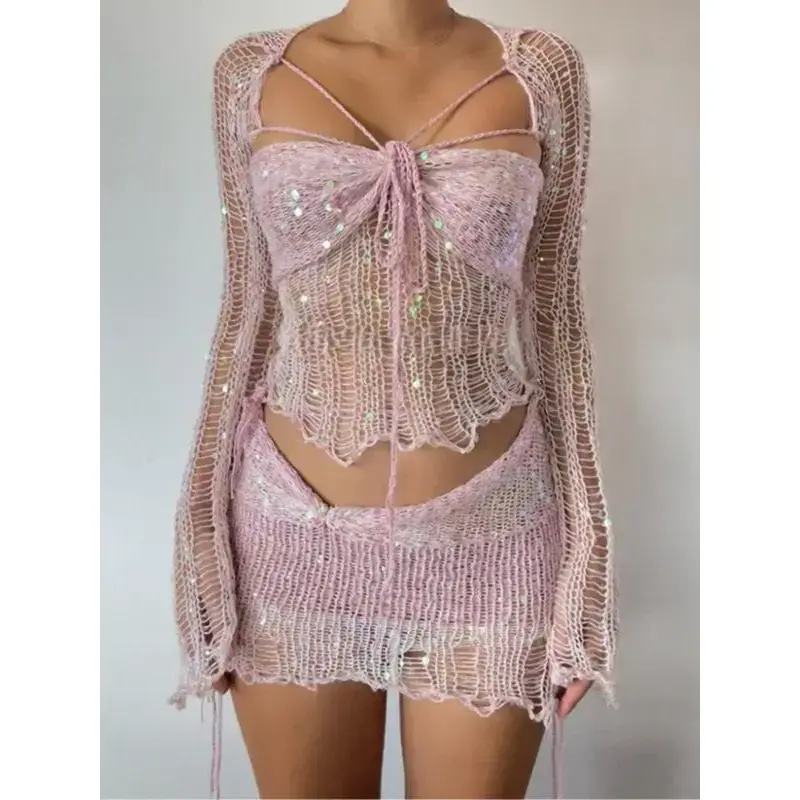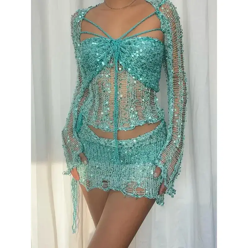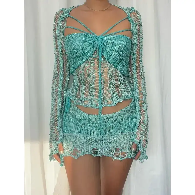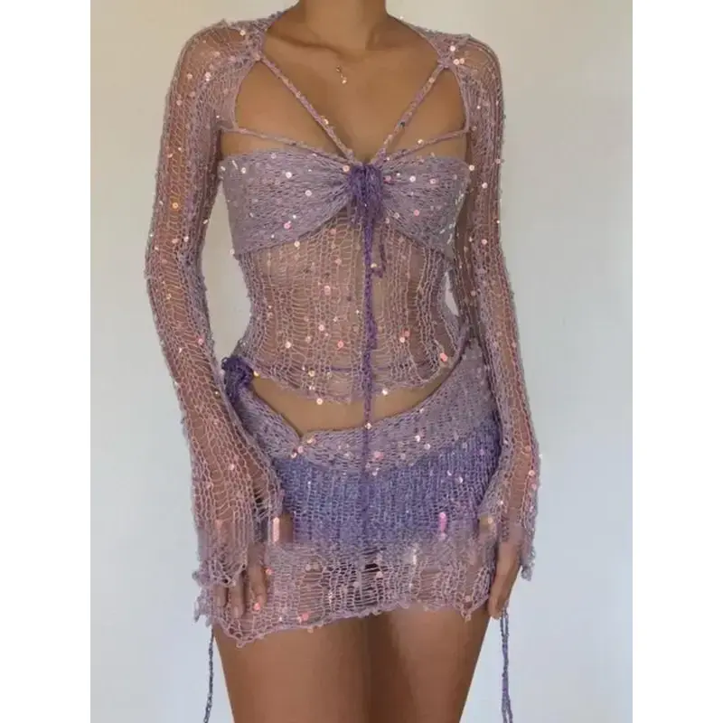 【Allure and Poise】: Dazzle at any party with the contrast sequin design, elevating the elegance of this women's glitter sequin sheer skirt set. 【Feminine Flair】: Charm with flounce sleeves and a tie-front top, adding a romantic touch to the ensemble perfect for dates and club outings. 【Sheer Sophistication】: Adopt a bold look with the sheer high-waist skirt, offering a blend of mystery and style for the fashion-forward woman. 【Sleek Silhouette】: Enjoy a slim-fitting design that accentuates curves, crafted from textile with slight stretch, ensuring a flattering fit for all body types. 【Seasonal Versatility】: Ideal for any season, this two-piece outfit can be styled in multiple ways, making it a staple for every fashionista's wardrobe.