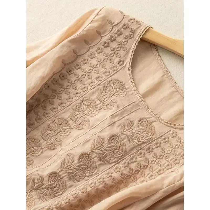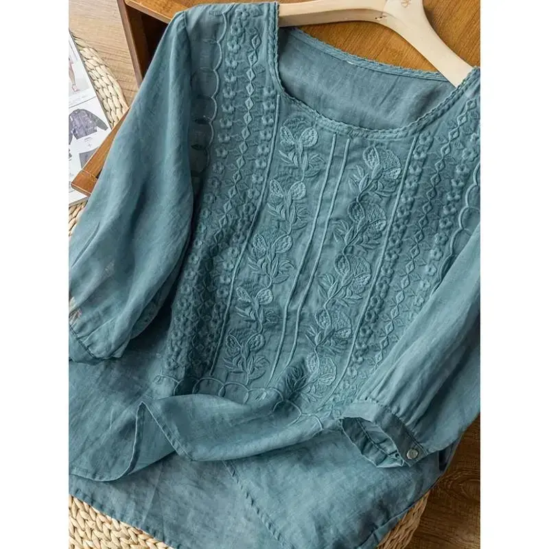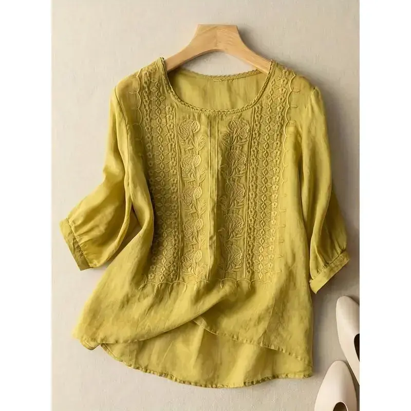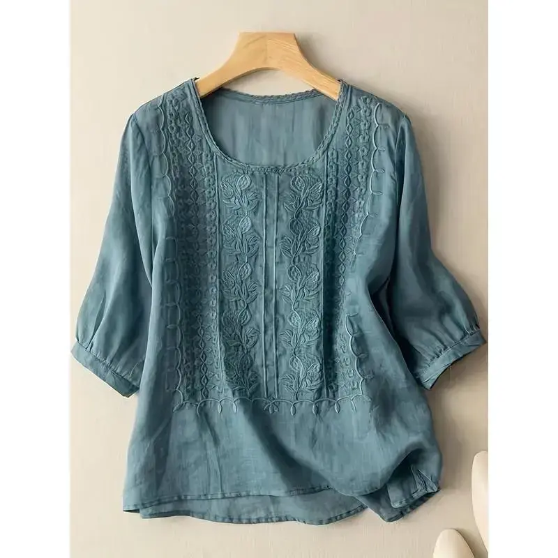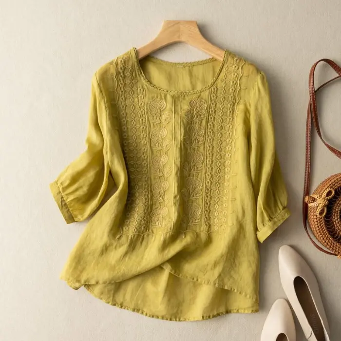 Women's Soft Cotton Linen Embroidered T-Shirt - Breathable, Skin-Friendly in Various Colors and Sizes