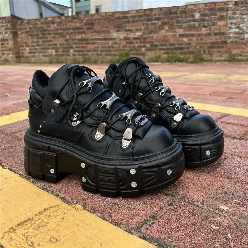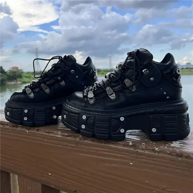 Unisex Retro Punk Chunky Platform Lace-up Shoes With Metallic Accents, Casual Footwear Sneaker Black
