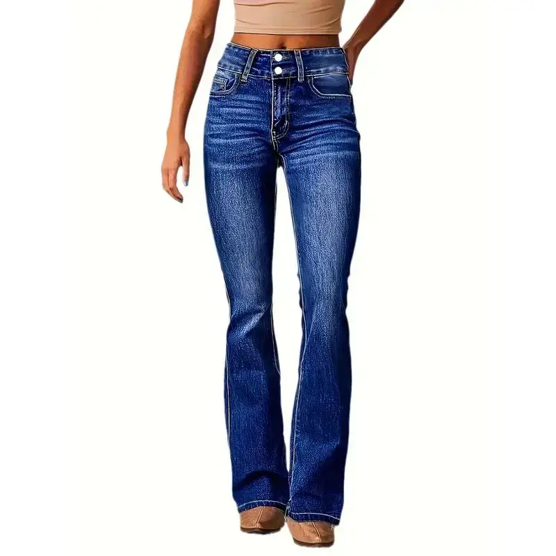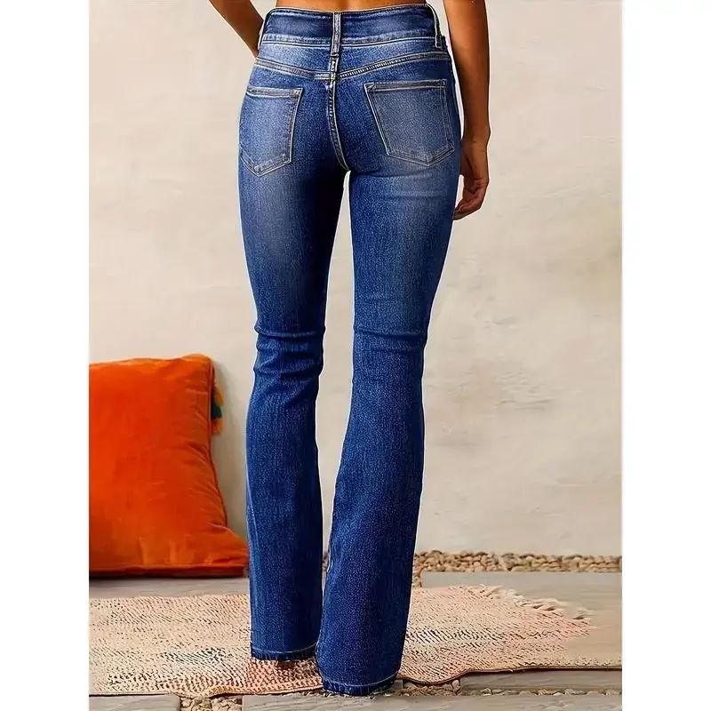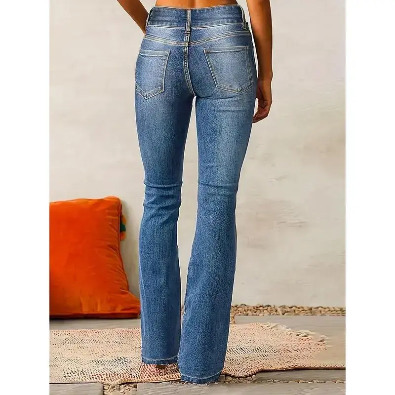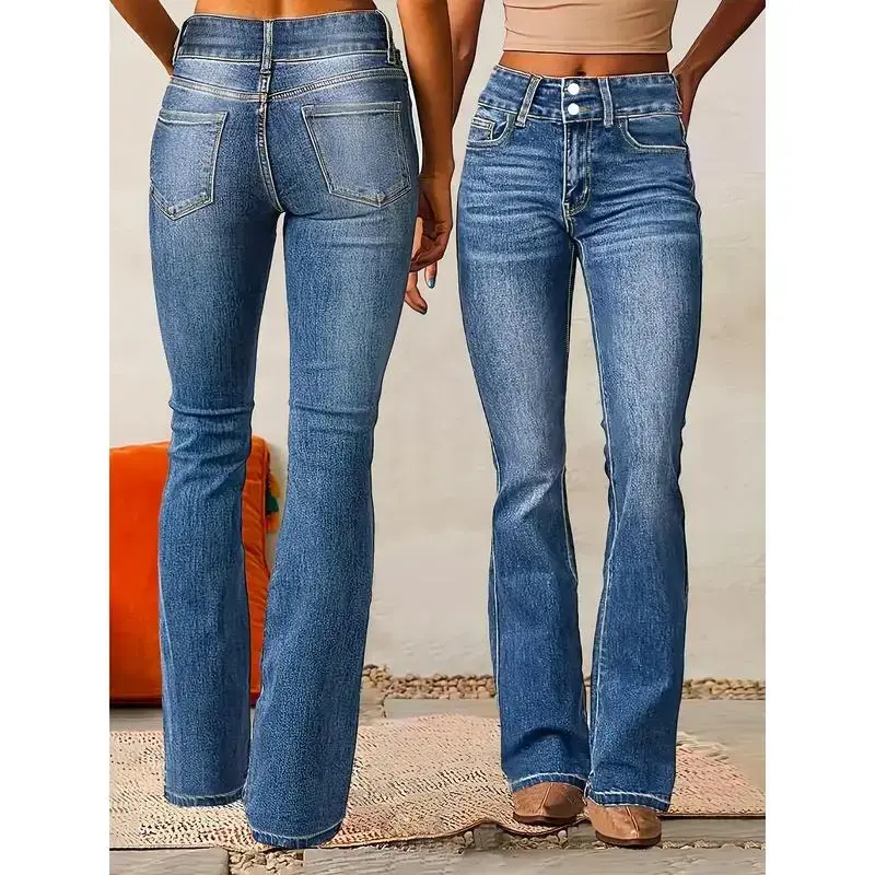 Women'sRetroStretchBootcutJeans-Mid-Rise,SlashPockets,WashedBlueDenim,ComfortFitwithButtonClosure