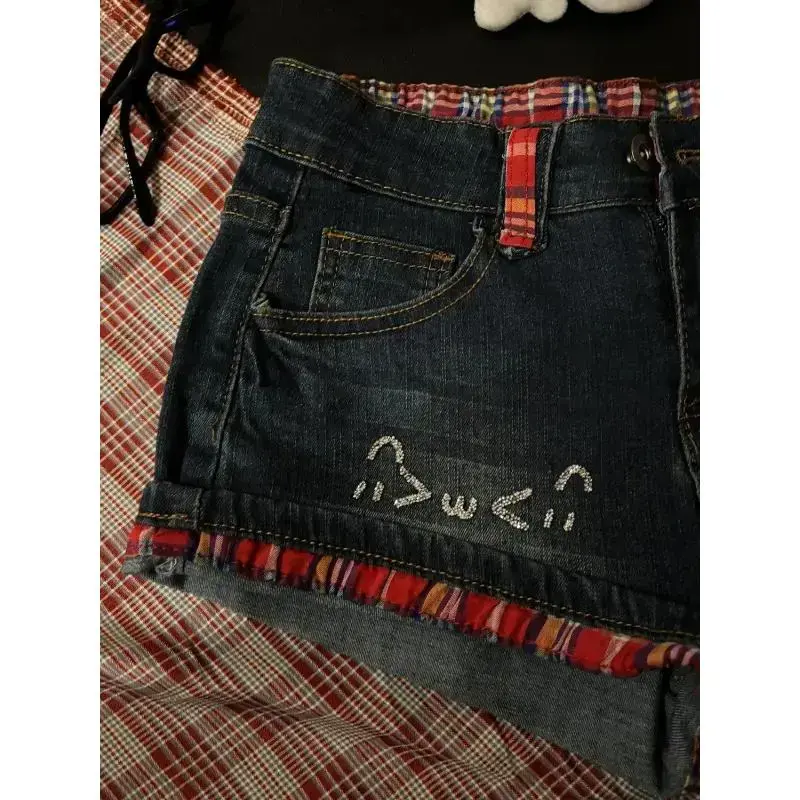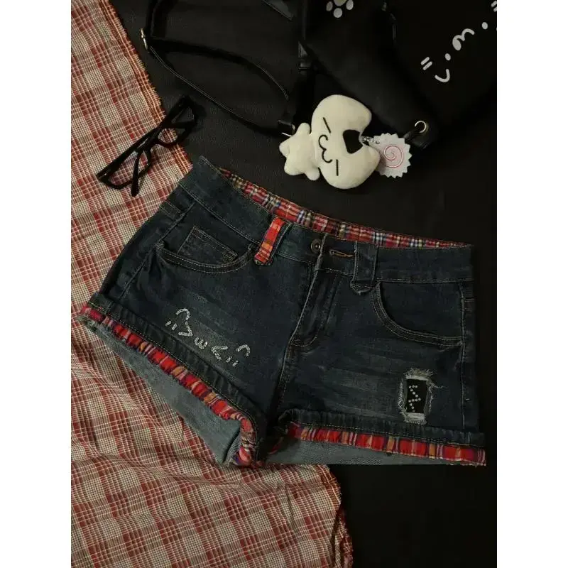 gym shorts Retro Red Plaid Splicing Denim Shorts Women's Summer Low Waist Slim Hip Wrap Hot Pants Y2k Shorts(gift)